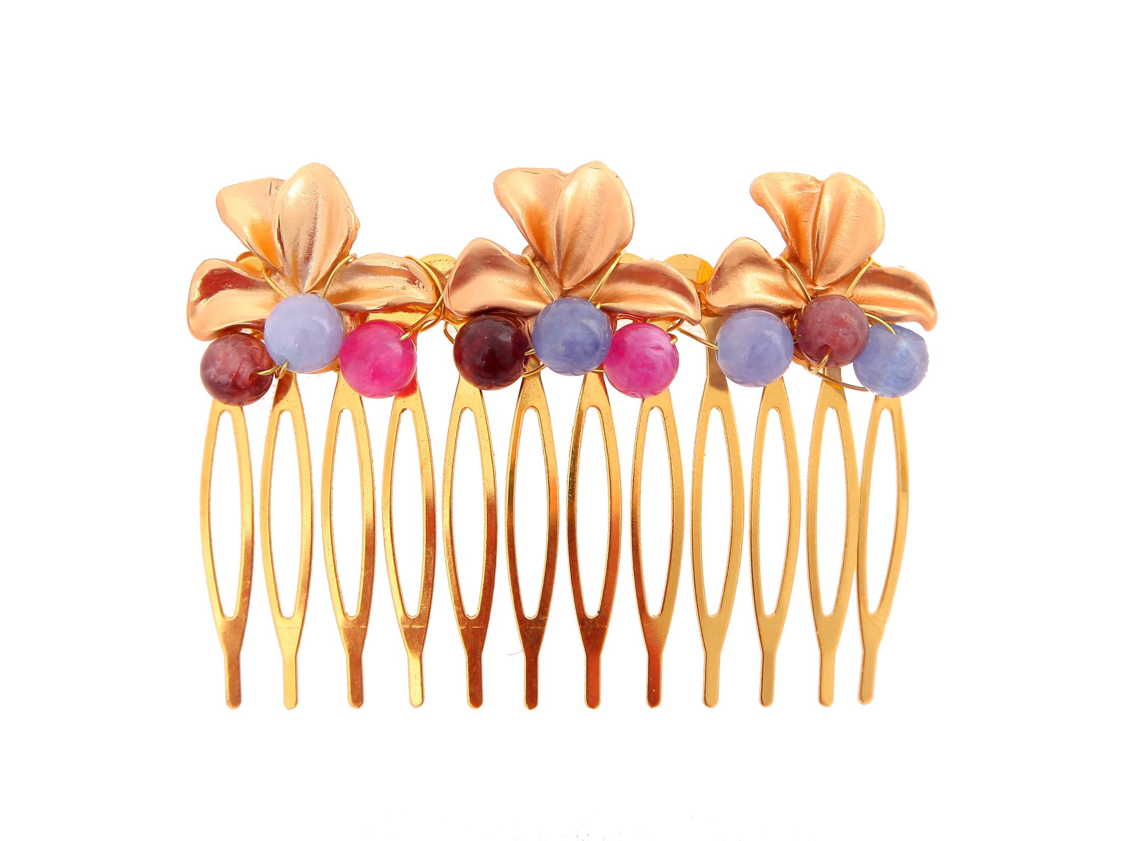 Peinecillo con fornitura de hoja y bolas de piedra Ágata en multipastel. Medidas aproximadas ancho x largo, 75x50mm. Fabricado artesanalmente en la provincia de Sevilla.