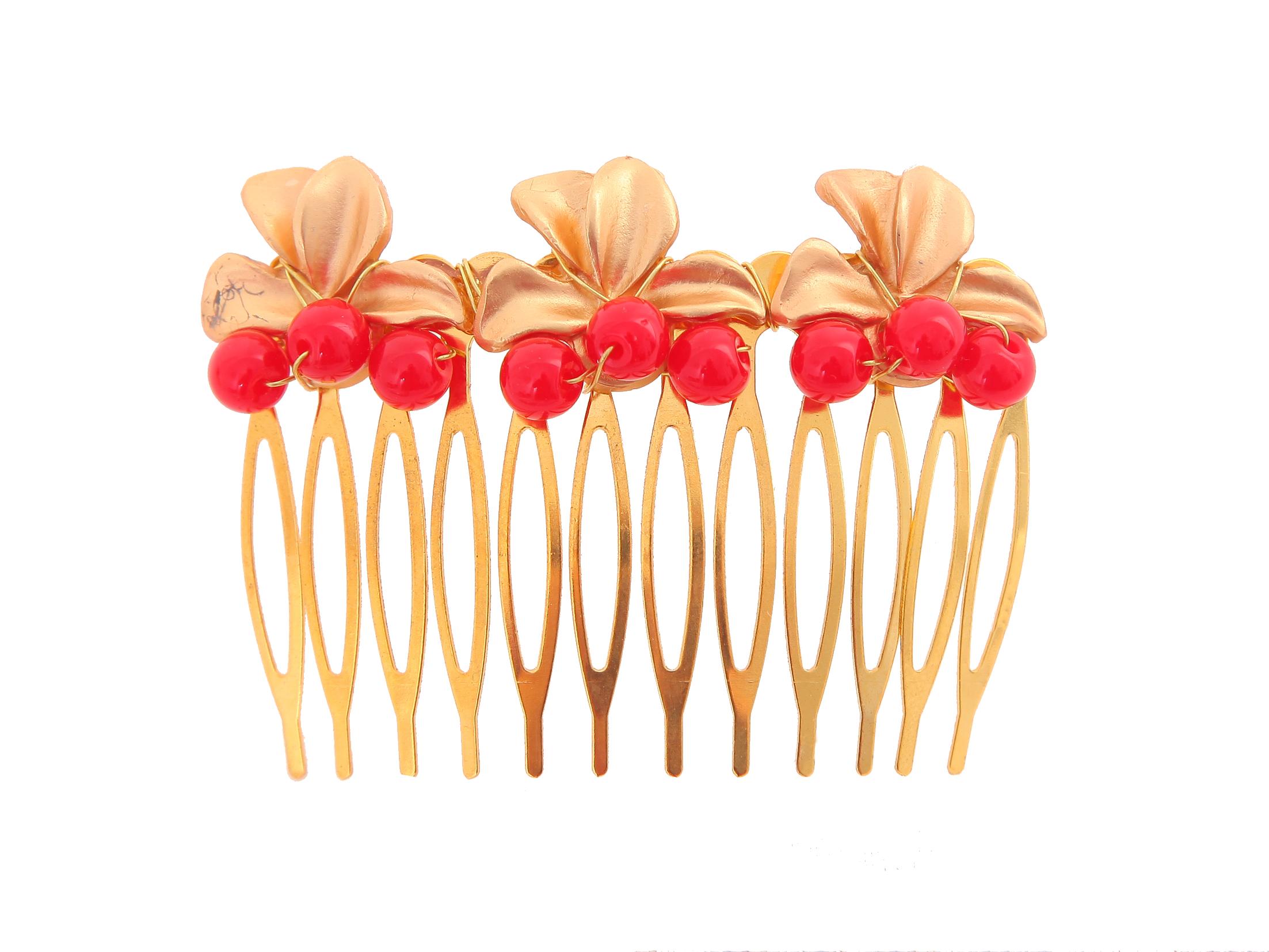 Peinecillo con fornitura de hoja y bolas de piedra Ágata en rojo. Medidas aproximadas ancho x largo, 75x50mm. Fabricado artesanalmente en la provincia de Sevilla.