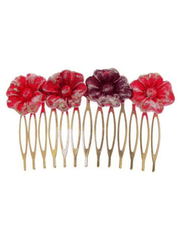 Peinecillo de flamenca en porcelana en tonos rojo degradé con reflejos dorados, peines metálicos que facilitan el agarre al pelo de la flamenca, y con medidas de 75 x 50 mm, fornitura metálica. Fabricado artesanalmente en Sevilla.