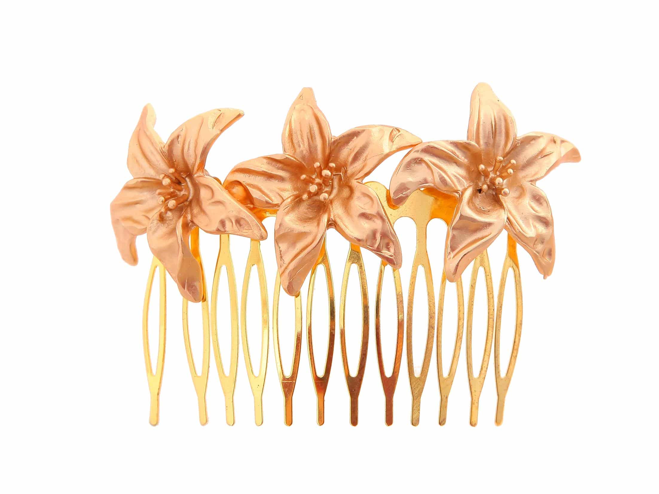 Peinecillo de flamenca dorado con acabado en mate. Medidas ancho x largo, 70x 50 mm (incluye horquilla). Fabricado artesanalmente en la provincia de Sevilla.