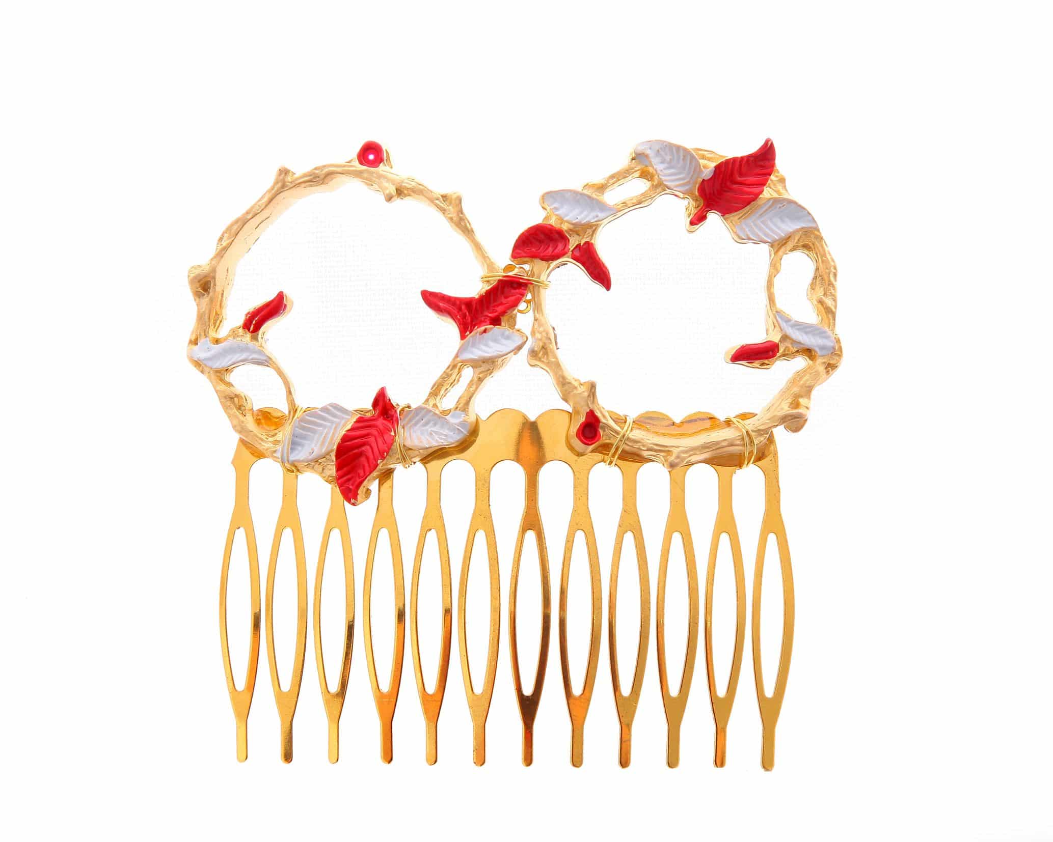 Peinecillo dorado de hojas pintado en blanco y rojo