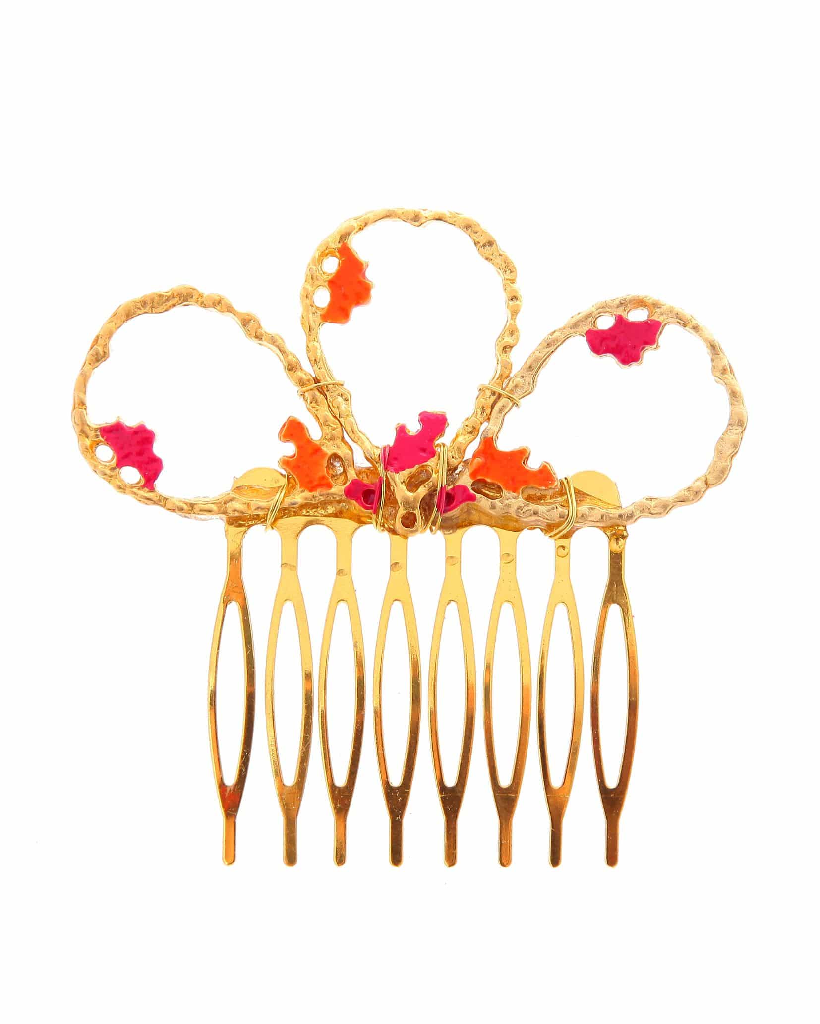 Peinecillo dorado mate pintado a mano en naranja y rosa. Medidas aproximadas ancho x largo; 6,5 x 6,5 cm. (incluyendo las púas). Fabricado artesanalmente en la provincia de Sevilla.