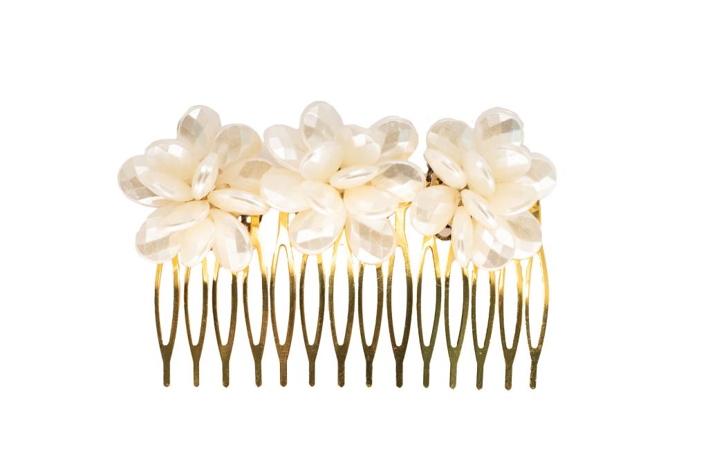 Peinecillo de flamenca de flores en nácar blanco. Medidas ancho x largo 70 x 45 mm (incluye horquilla). Fabricado artesanalmente en la provincia de Sevilla.