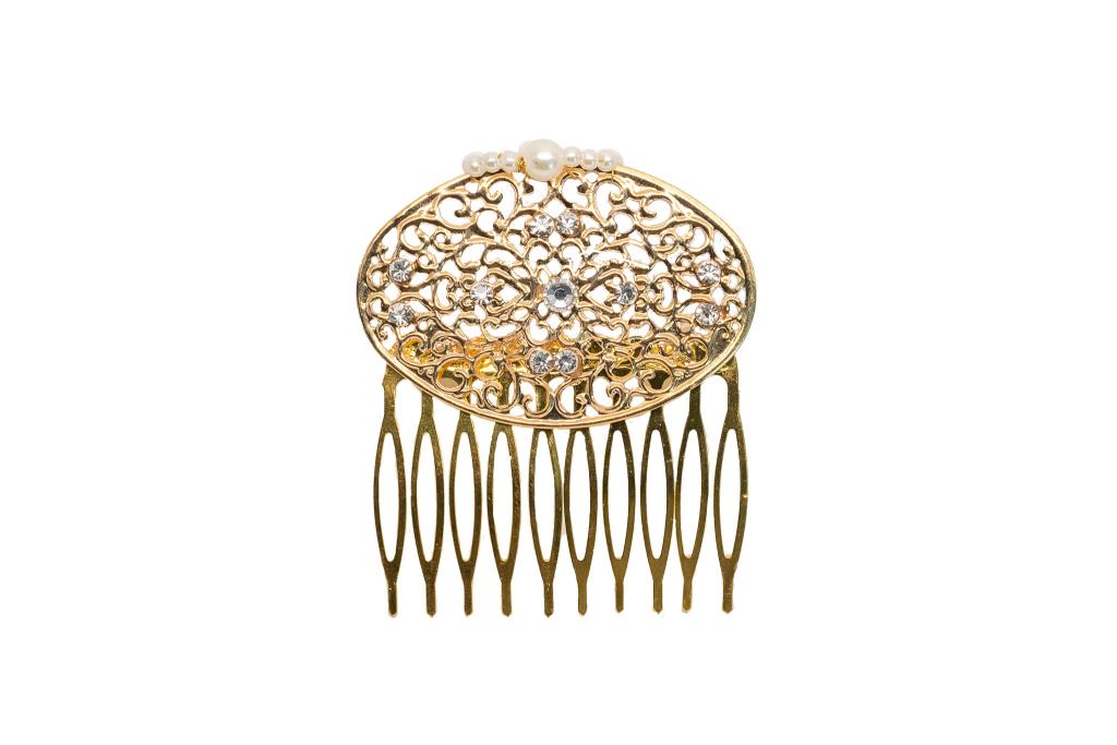 Peinecillo de flamenca metal con brillos y perlas en blancas. Medidas ancho x largo 50 x 60 mm (incluye horquilla). Fabricado artesanalmente en la provincia de Sevilla.