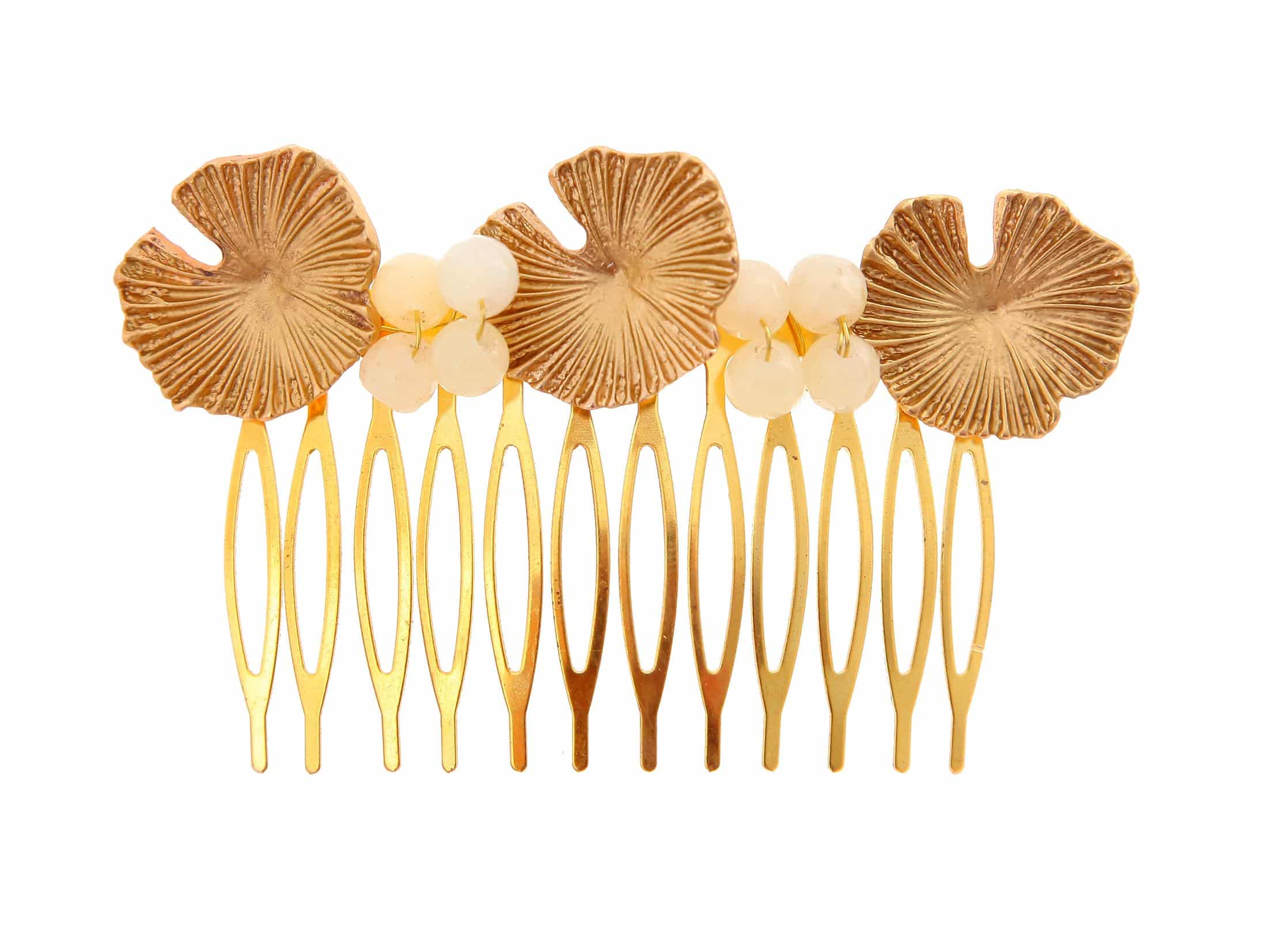 Peinecillo con fornitura de nenúfar y bolas de piedra Ágata beige. Medidas aproximadas ancho x largo, 80x50mm. Fabricado artesanalmente en la provincia de Sevilla.