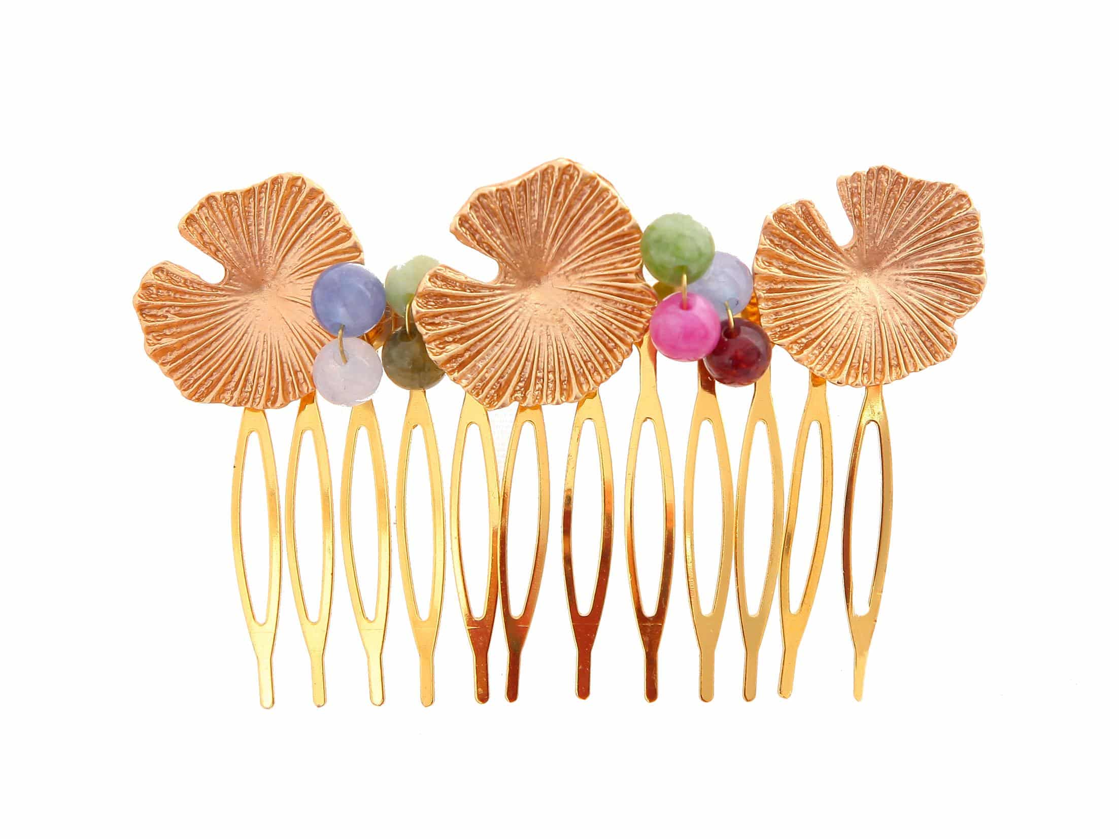 Peinecillo con fornitura de nenúfar y bolas de piedra Ágata en multipastel. Medidas aproximadas ancho x largo, 80x50mm. Fabricado artesanalmente en la provincia de Sevilla.