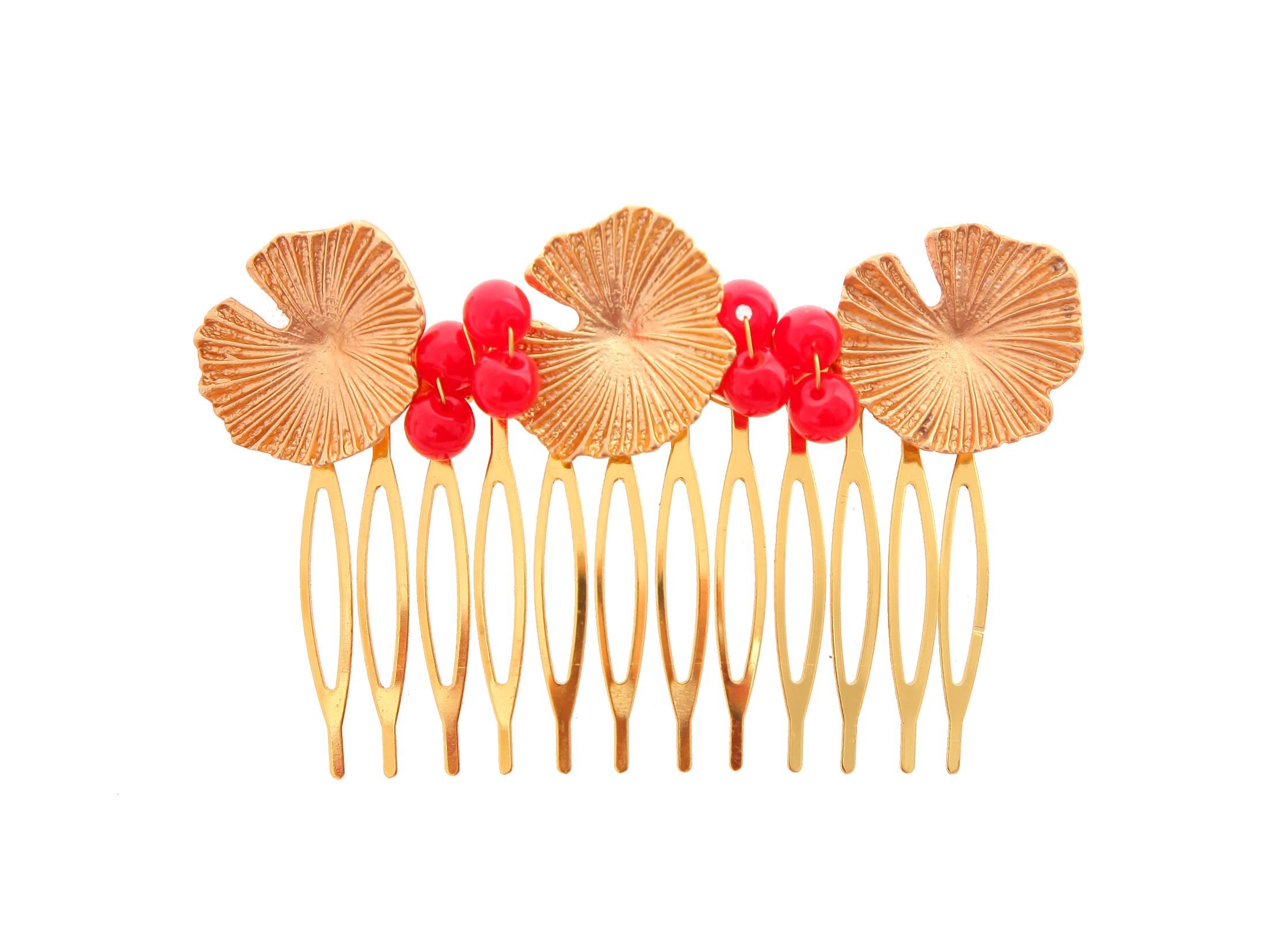 Peinecillo con fornitura de nenúfar y bolas de piedra Ágata color rojo. Medidas aproximadas ancho x largo, 80x50mm. Fabricado artesanalmente en la provincia de Sevilla.