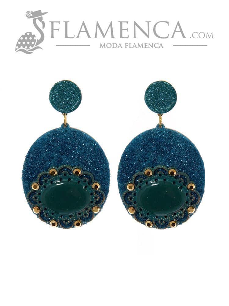 Pendiente de flamenca en color agua marina, con forma ovalada, fornitura metálica, cierre omega, y con medidas: 46 x 57 mm (sin cabezal). Fabricado artesanalmente en Sevilla.