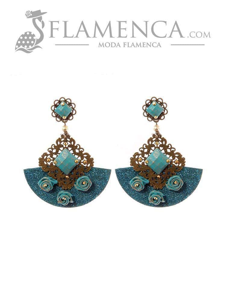 Pendiente de flamenca en color agua marina, con forma de abanico, fornitura metálica, cierre omega, y con medidas: 78 x 75 mm (sin cabezal). Fabricado artesanalmente en Sevilla.