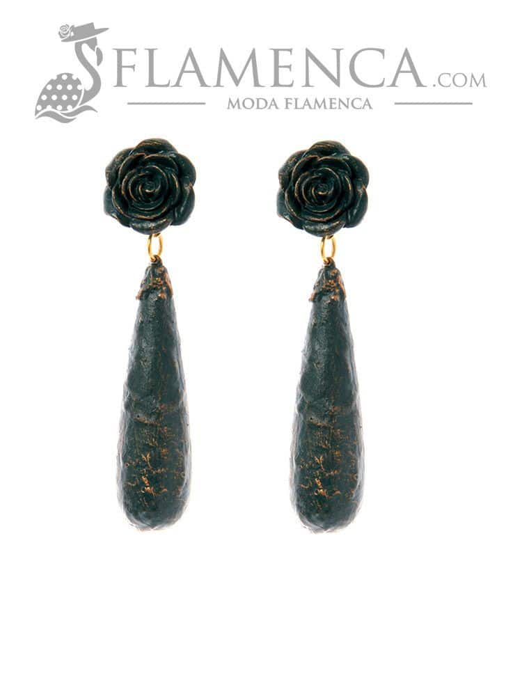 Pendiente de flamenca en color agua marina con reflejos en oro, con forma de lágrima, fornitura metálica, cierre omega, y con medidas: 14 x 60 mm (sin cabezal). Fabricado artesanalmente en Sevilla.