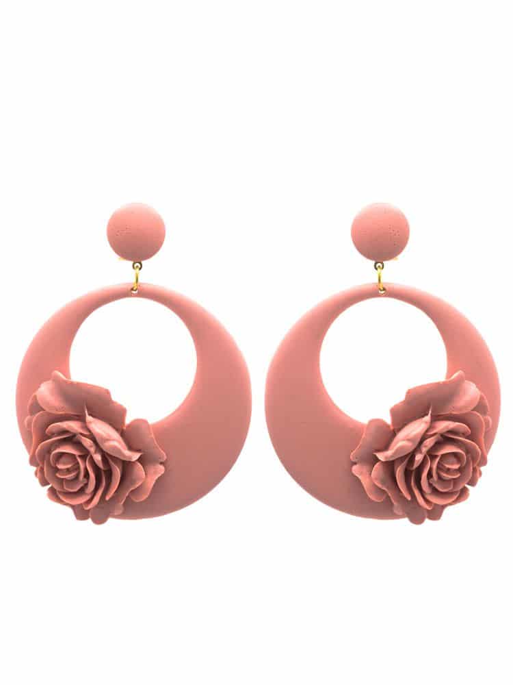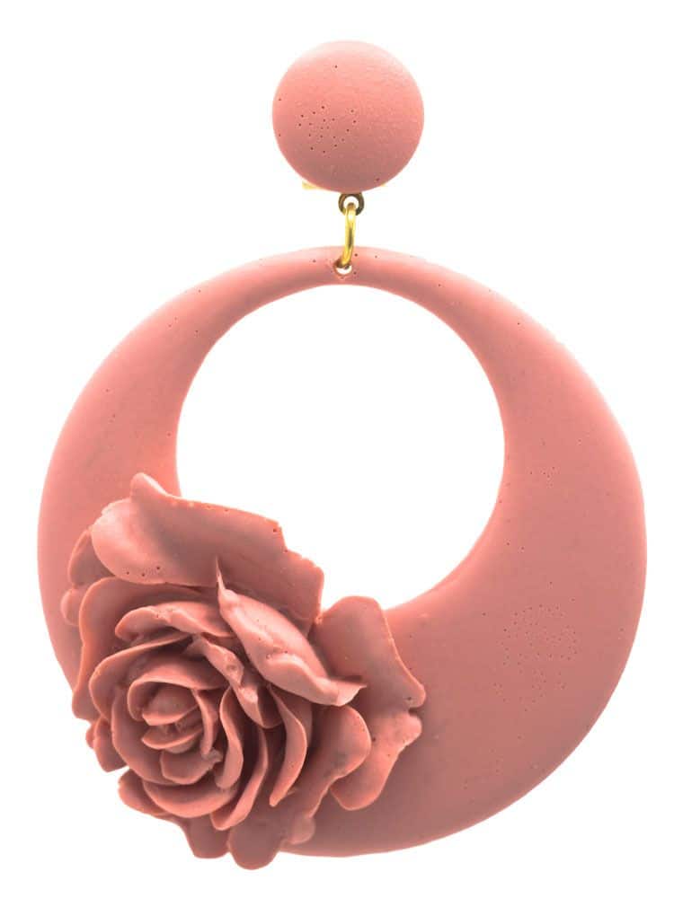 Pendiente de flamenca de resina en forma de aro con detalle floral en color maquillaje claro. Cierre omega y con medidas: 65 x 65 mm (sin cabezal). Fabricado artesanalmente en Sevilla.