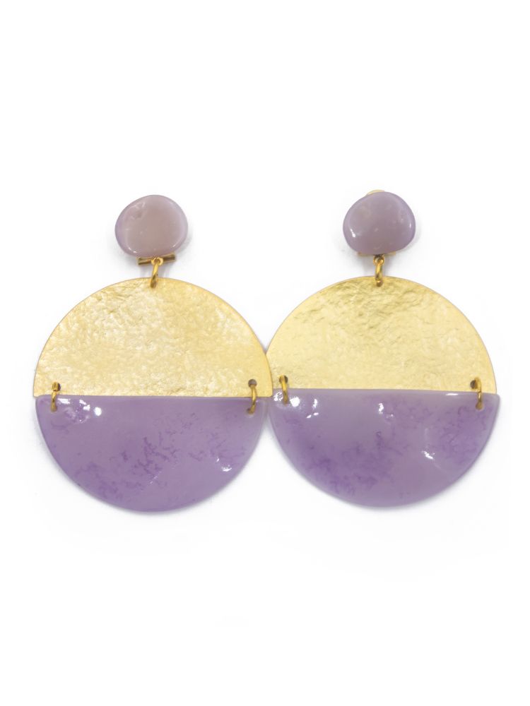 Pendiente de flamenca aro grande piedras cristal color malva y metal dorado. Cierre omega. Medida 58×75 mm (con cabezal). Fabricado artesanalmente en la provincia de Sevilla.