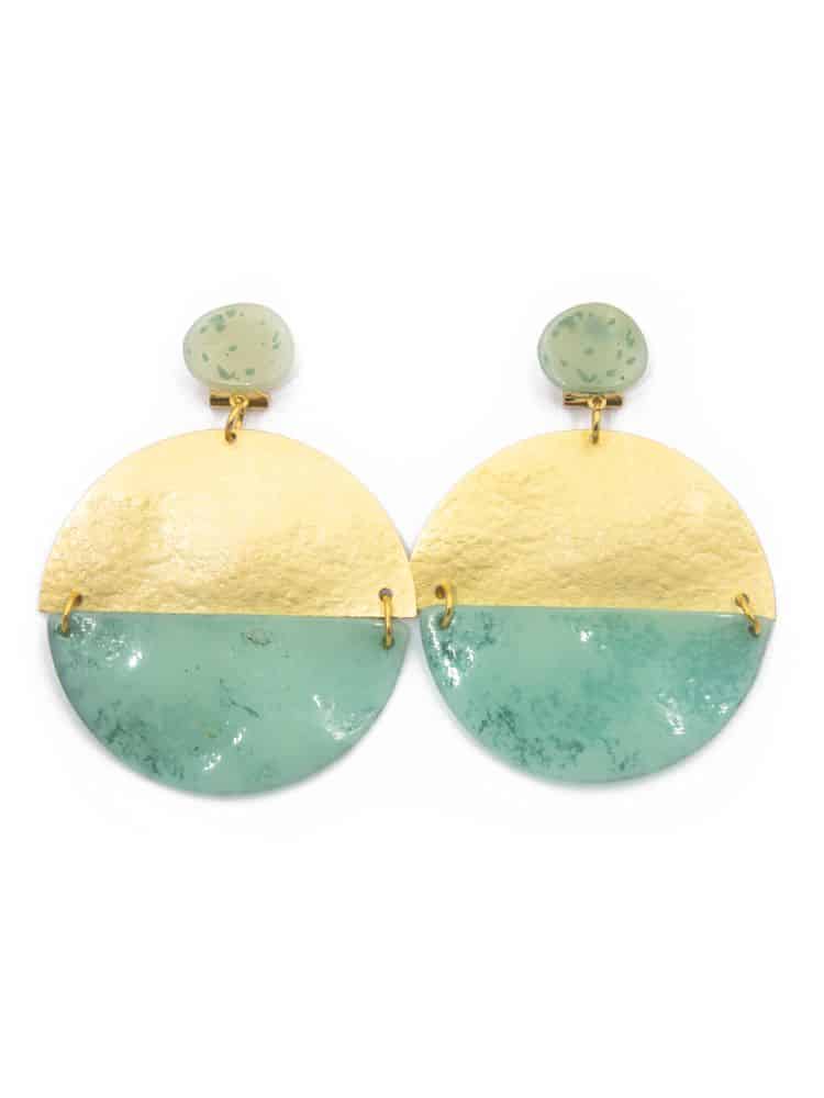 Pendiente dorado de dos círculos labrados, esfera final turquesa y aplique estilo acuarela