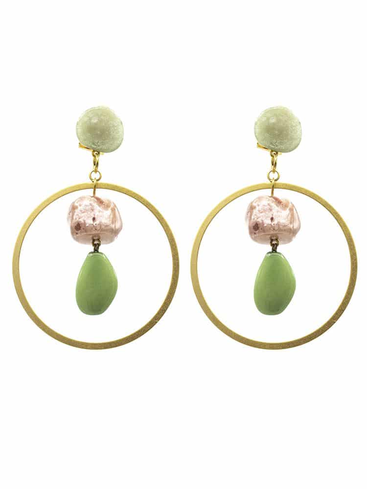 Pendiente de flamenca aro grande piedras nácar color verde agua y maquillaje. Cierre omega. Medida 55×55 mm (sin cabezal). Fabricado artesanalmente en la provincia de Sevilla.