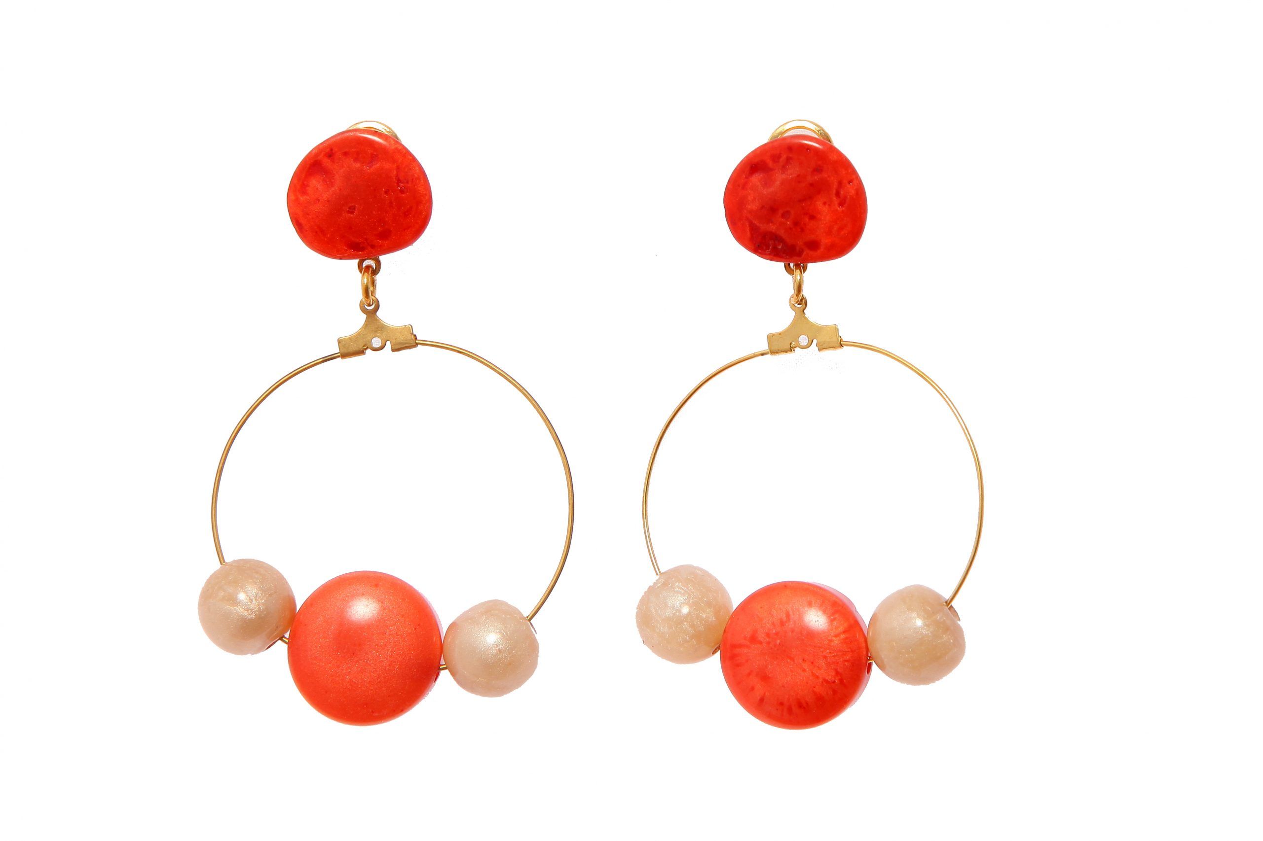 Pendiente de flamenca aro mediano piedras nácar color coral y beige. Cierre omega. Medida 42×70 mm (con cabezal). Fabricado artesanalmente en la provincia de Sevilla.