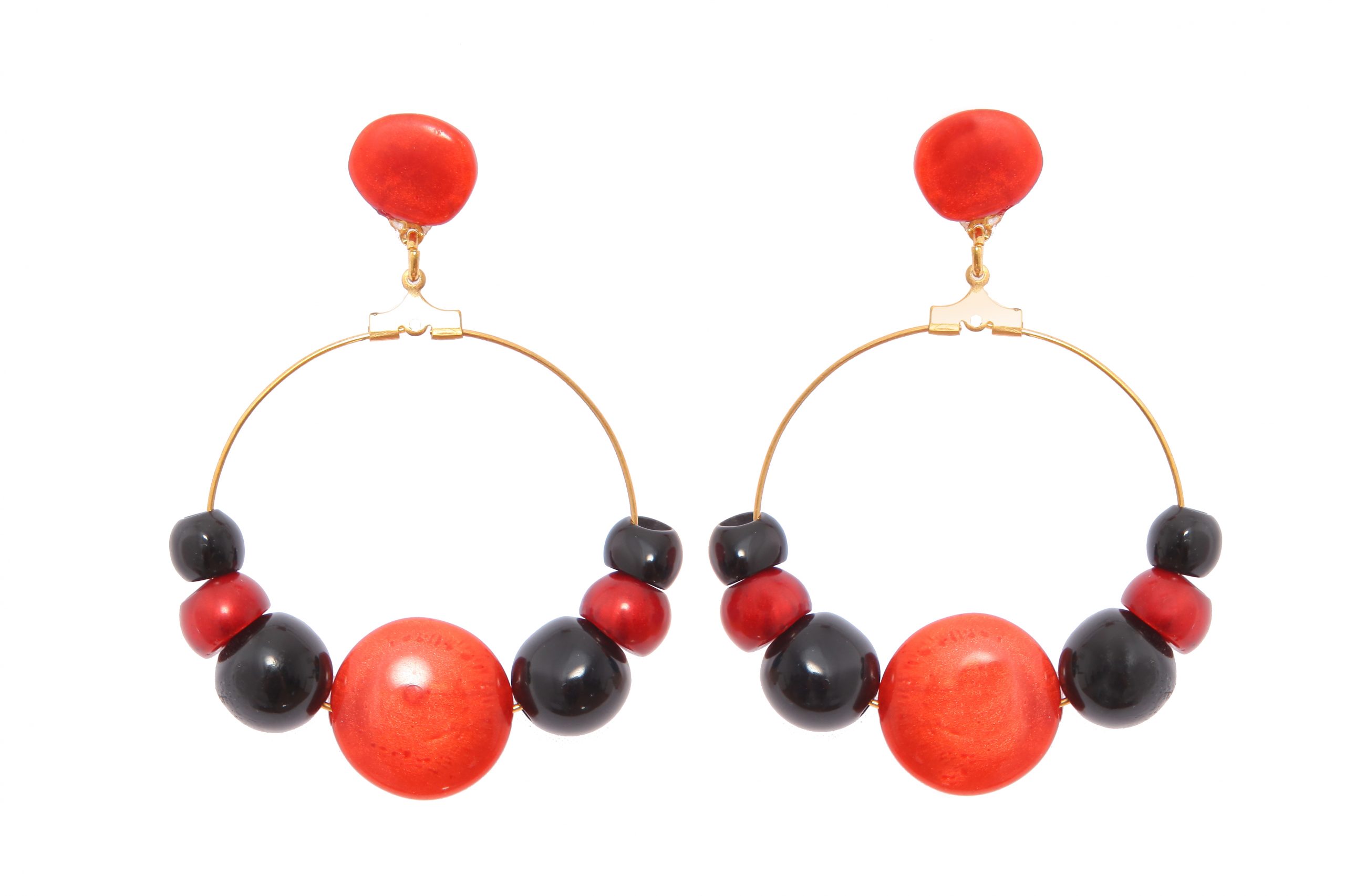 Pendiente de flamenca aro mediano piedras nácar color coral y negro