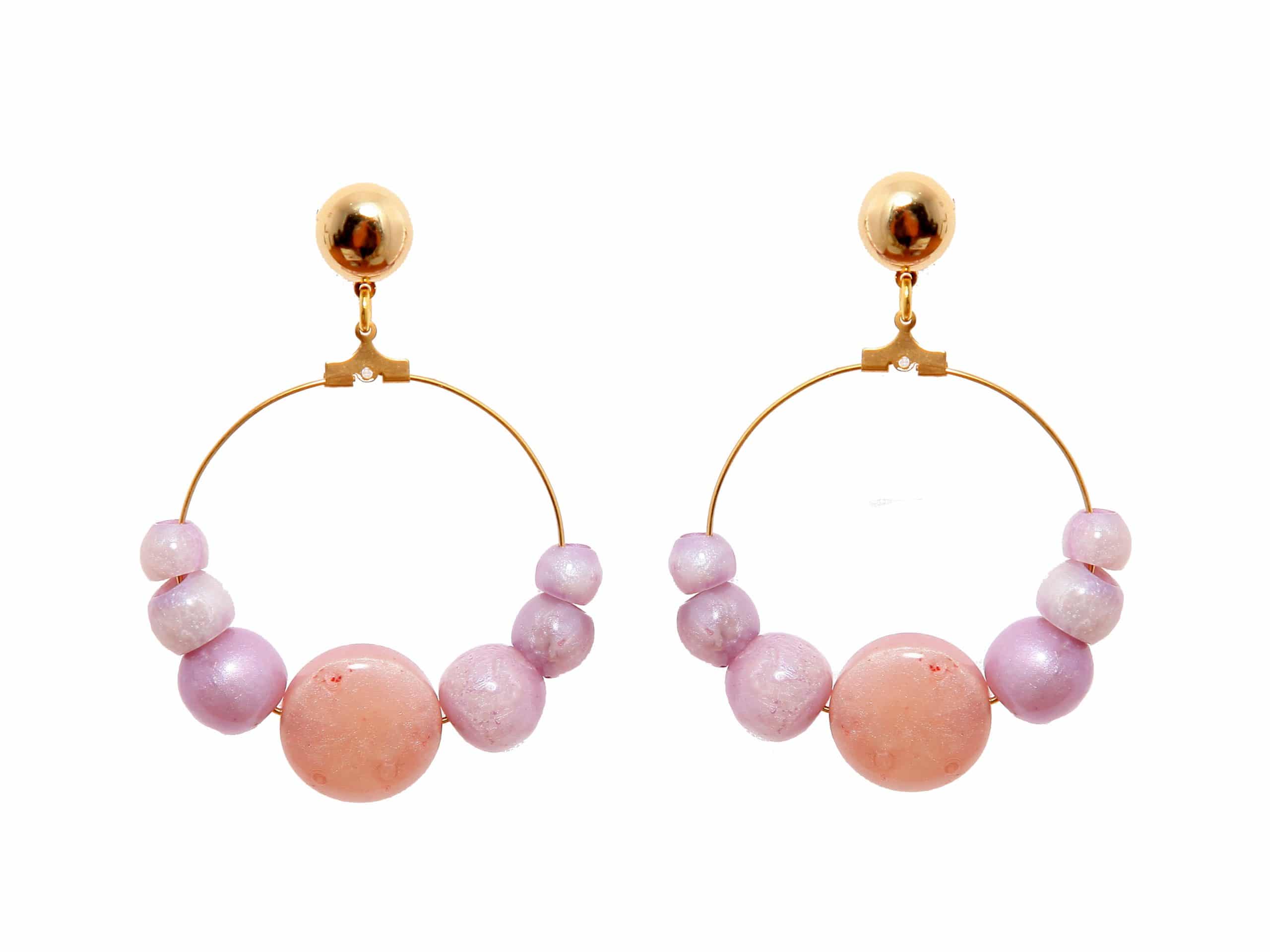 Pendiente de flamenca aro mediano piedras nácar color malva. Cierre a presión. Medida 50×80 mm (con cabezal). Fabricado artesanalmente en la provincia de Sevilla.