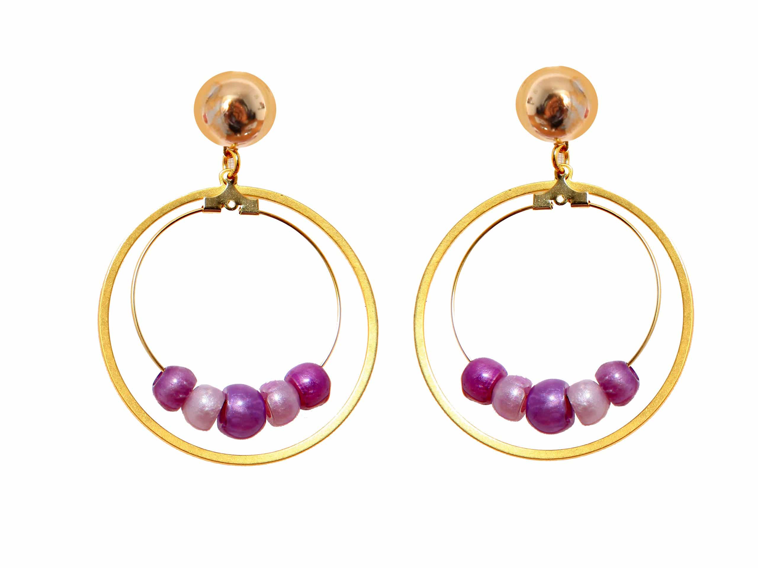 Pendiente de flamenca aro mediano piedras nácar color morado y malva. Cierre a presión. Medida 45×68 mm (con cabezal). Fabricado artesanalmente en la provincia de Sevilla.