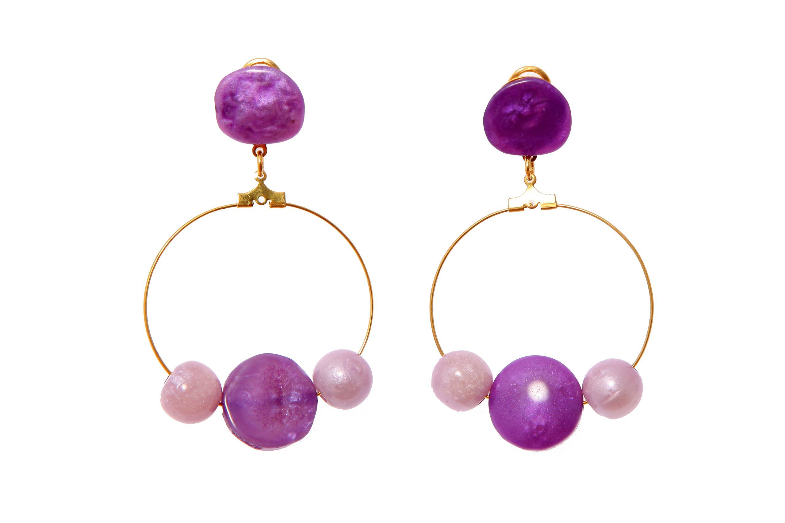 Pendiente de flamenca aro mediano piedras nácar color morado y malva