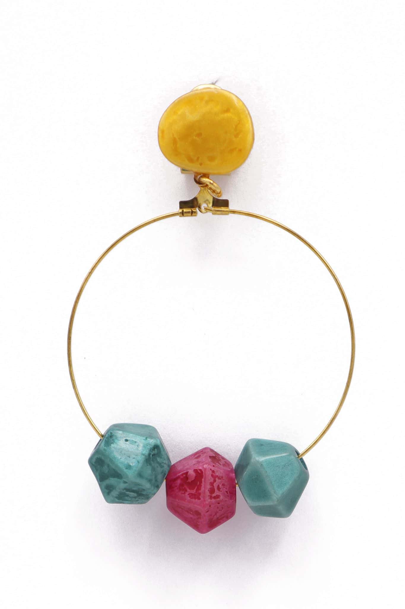Pendiente de flamenca aro mediano piedras nácar color mostaza, aguamarina y buganvilla