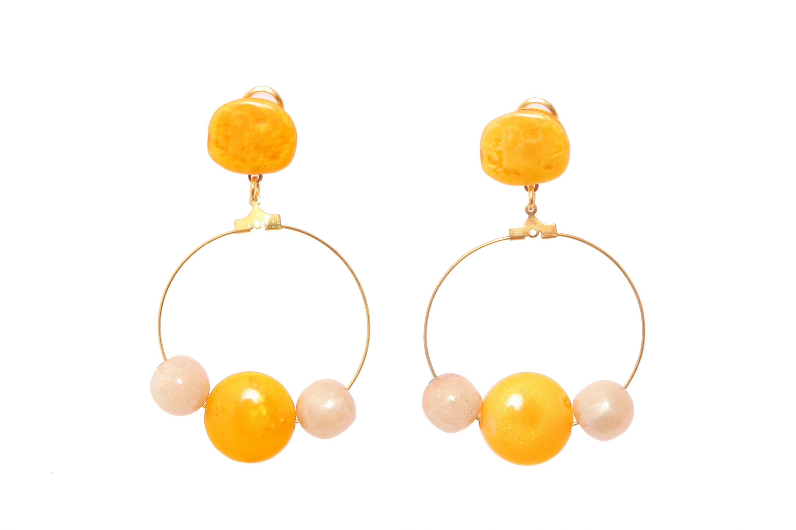 Pendiente de flamenca aro mediano piedras nácar color mostaza y beige. Cierre omega. Medida 42×70 mm (con cabezal). Fabricado artesanalmente en la provincia de Sevilla.