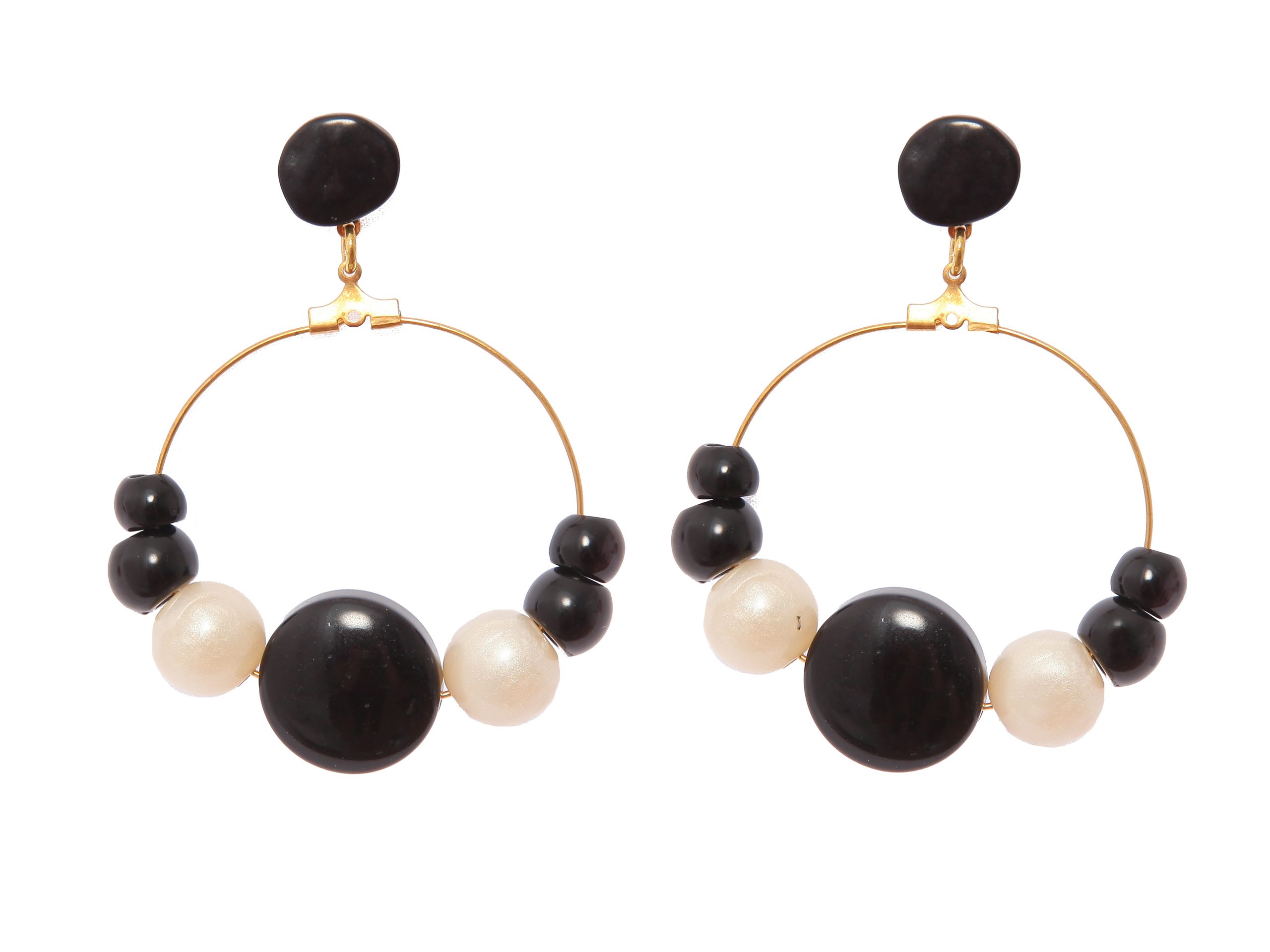 Pendiente de flamenca aro mediano piedras nácar color negro y marfil. Cierre a presión. Medida 52×68 mm (con cabezal). Fabricado artesanalmente en la provincia de Sevilla.