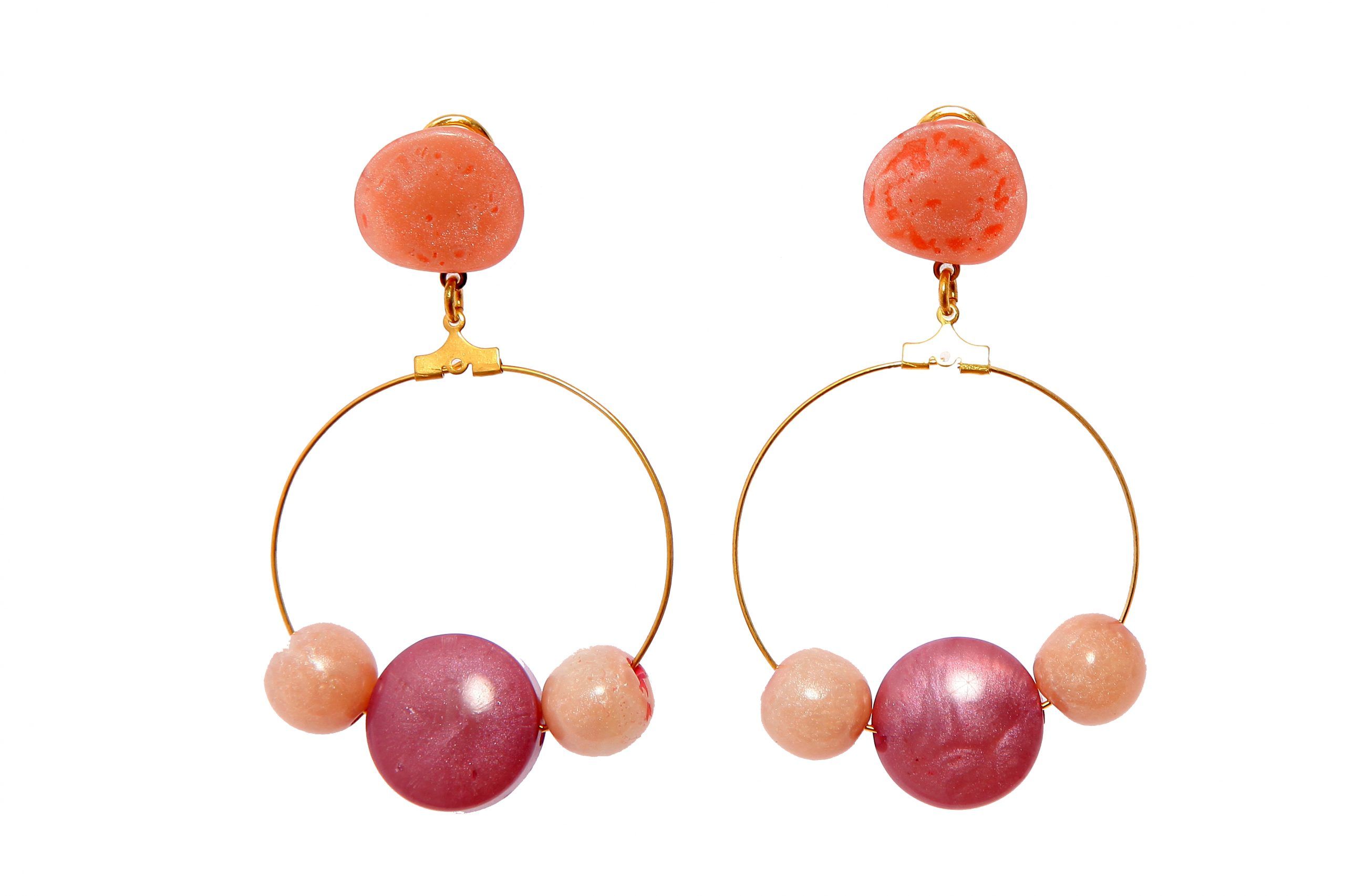 Pendiente de flamenca aro mediano piedras nácar color rosa, beige y malva. Cierre omega. Medida 42×70 mm (con cabezal). Fabricado artesanalmente en la provincia de Sevilla.