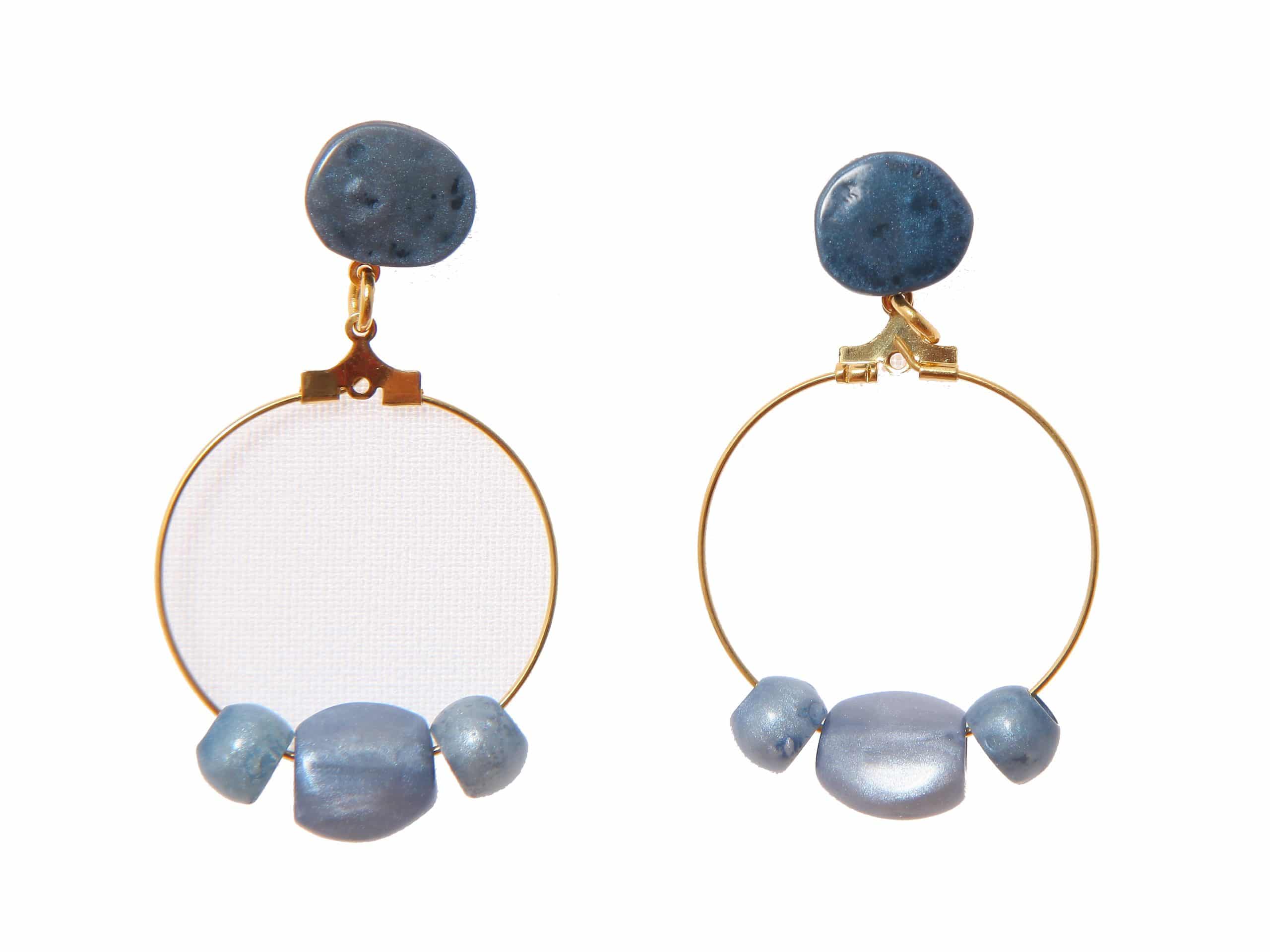Pendiente de flamenca aro pequeño piedras nácar color azul ducado y azafata. Cierre a presión. Medida 27×47 mm (con cabezal). Fabricado artesanalmente en la provincia de Sevilla.