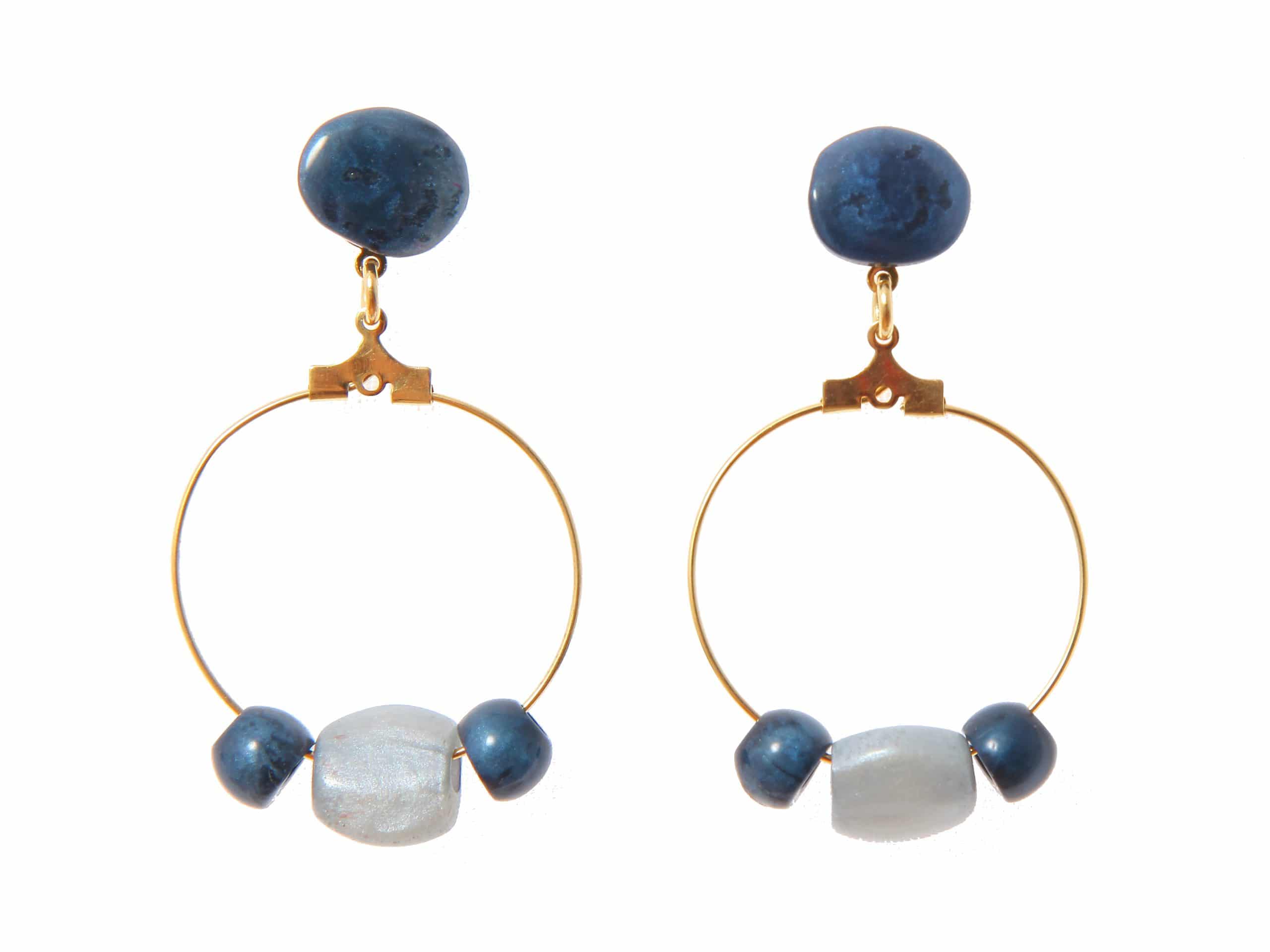 Pendiente de flamenca aro pequeño piedras nácar color azul petróleo y azafata