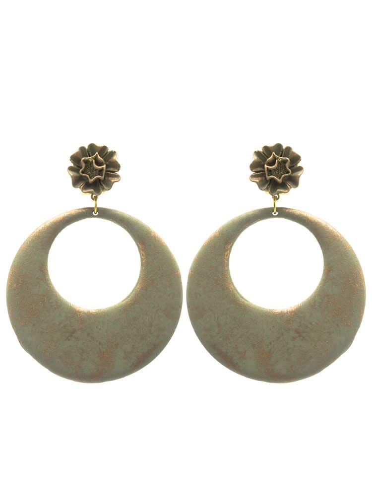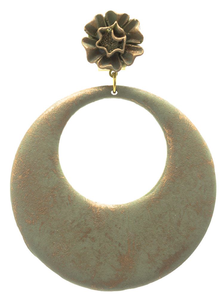 Pendiente de flamenca en forma de aro color verde caqui con reflejos de oro y detalle floral en tacha. Cierre omega y con medidas: 65 x 65 mm (sin cabezal). Fabricado artesanalmente en Sevilla.
