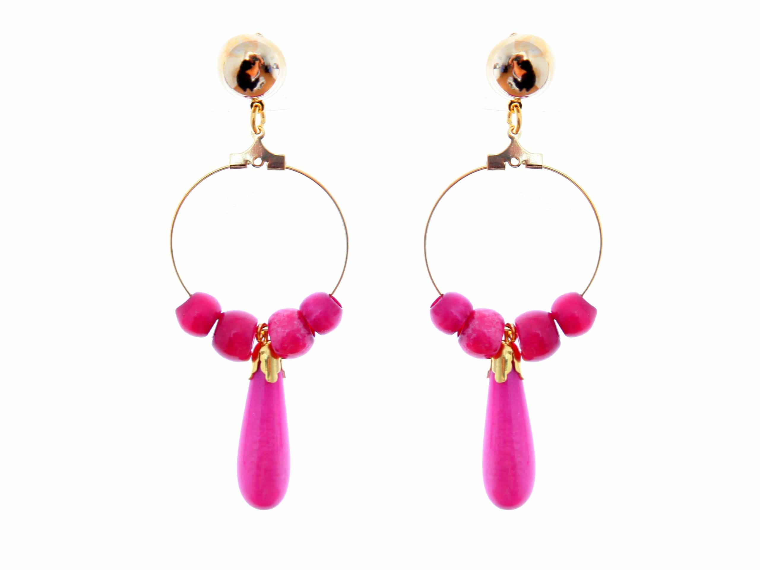 Pendiente de flamenca aro y lágrima mediano piedras nácar color buganvilla. Cierre a presión. Medida 25×75 mm (con cabezal). Fabricado artesanalmente en la provincia de Sevilla.