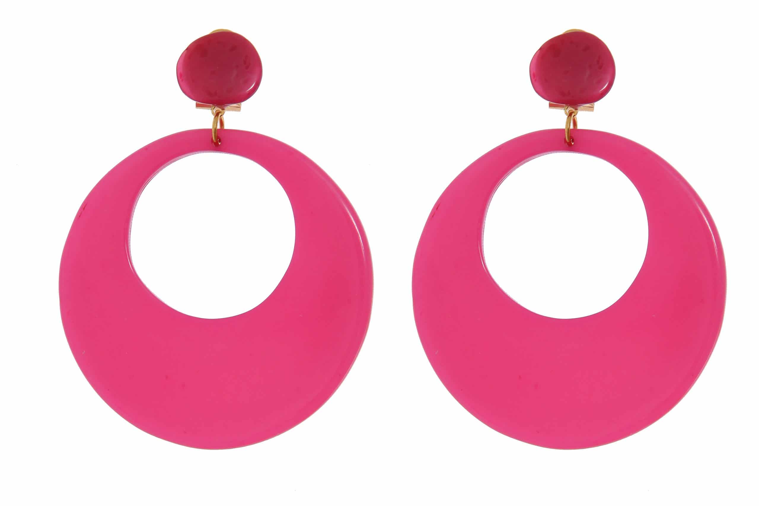 Pendiente de flamenca de resina cristal de color Buganvilla . Cierre omega. Diámetro 65mm (sin cabezal). Fabricado artesanalmente en la provincia de Sevilla.
