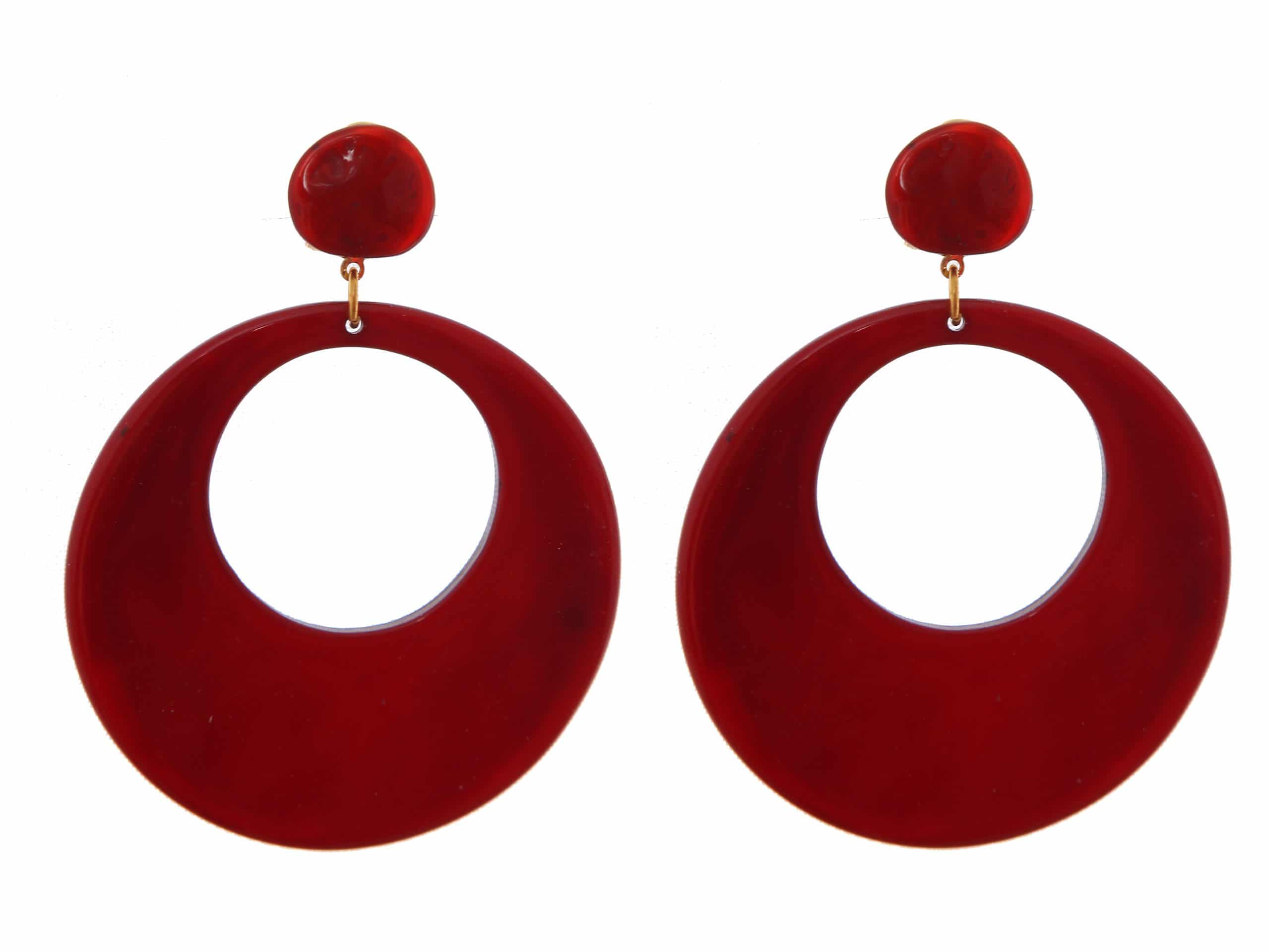 Pendiente de flamenca de resina cristal de color Burdeos. Cierre omega. Diámetro 65mm (sin cabezal). Fabricado artesanalmente en la provincia de Sevilla.