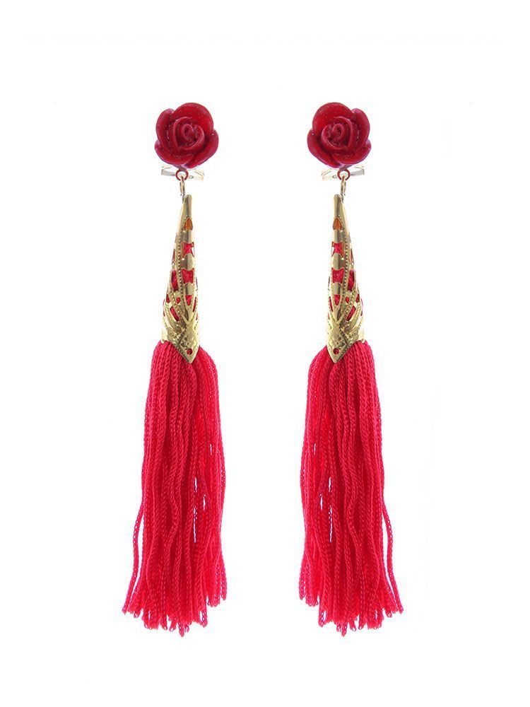Pendiente de flamenca de flecos en color rojo con capuchón metálico dorado y cabezal de resina en forma de flor. Cierre omega. Medida: 10 x 100 mm (sin cabezal). Fabricado artesanalmente en Sevilla.