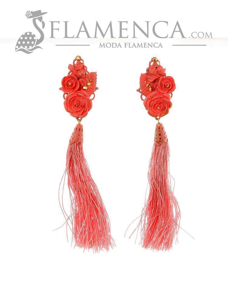 Pendiente de flamenca de flecos en color maquillaje, cierre omega, y con medidas: 29 x 145 mm. El cabezal está adornado con detalles florales. Fabricado artesanalmente en Sevilla.