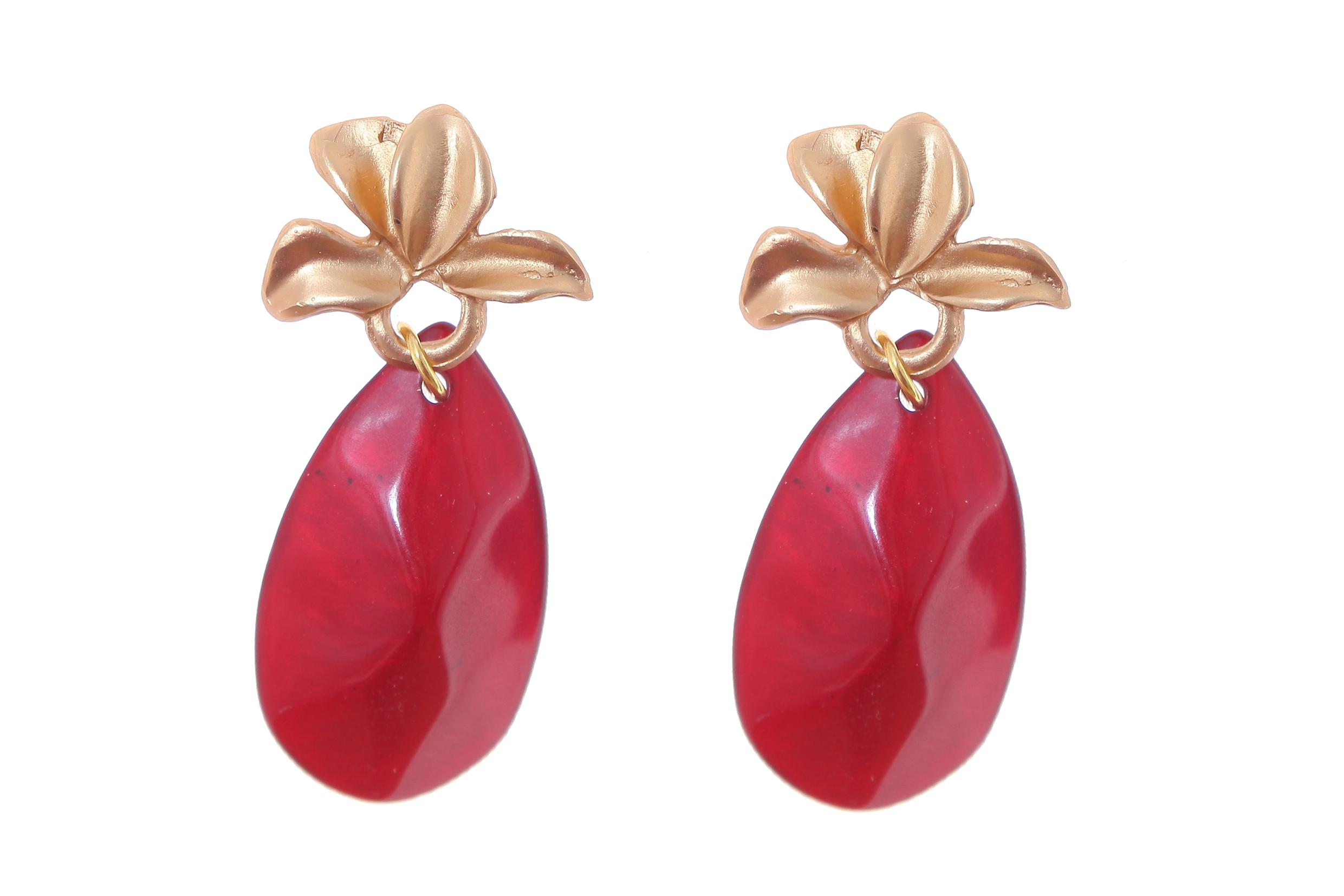 Pendiente de flamenca de piedra cristal de color burdeos con cabezal de hojas. Cierre de tornillo. Medidas 25x55mm (con cabezal). Fabricado artesanalmente en la provincia de Sevilla.