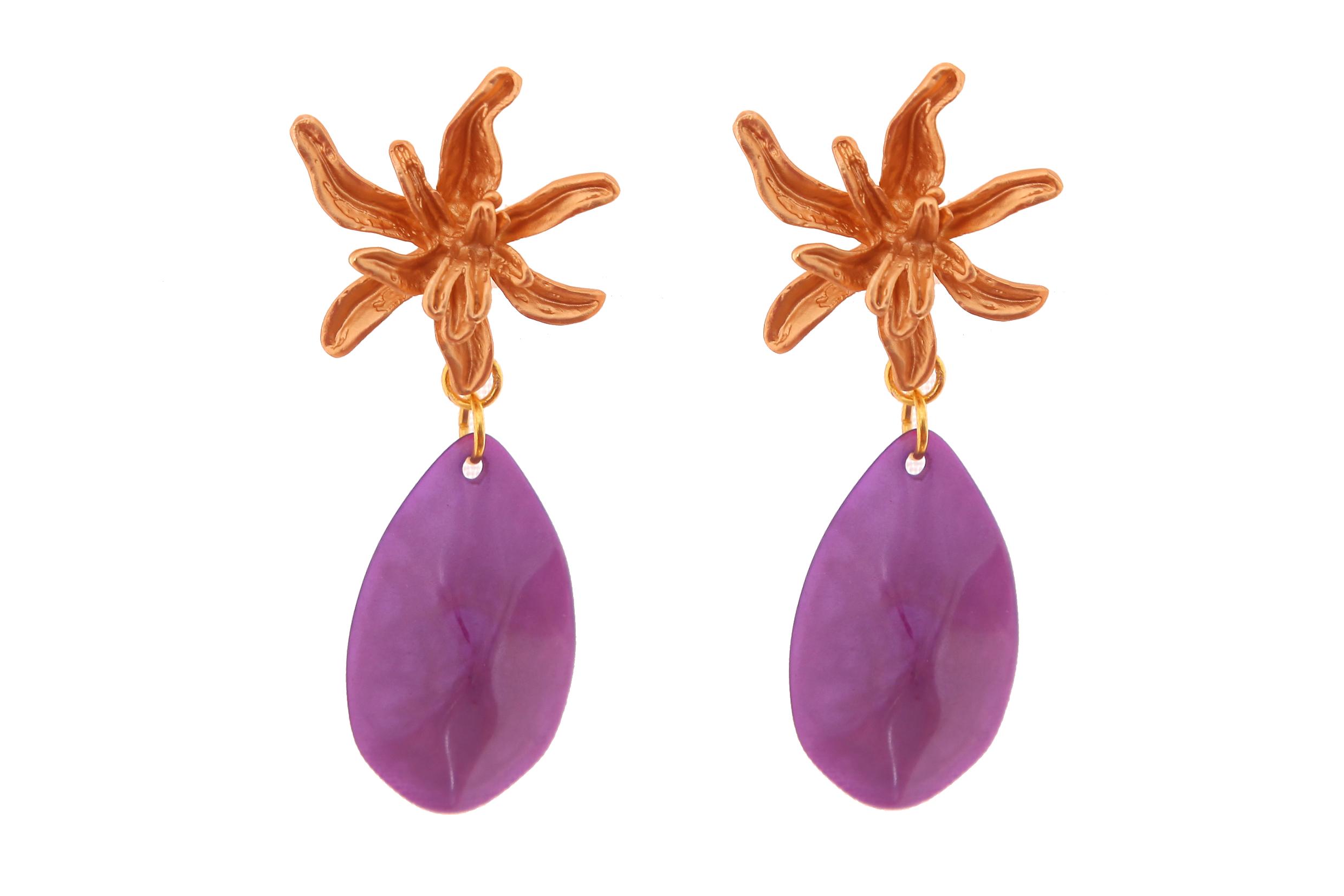 Pendiente de flamenca de lágrima de piedra cristal color malva con cabezal de flor