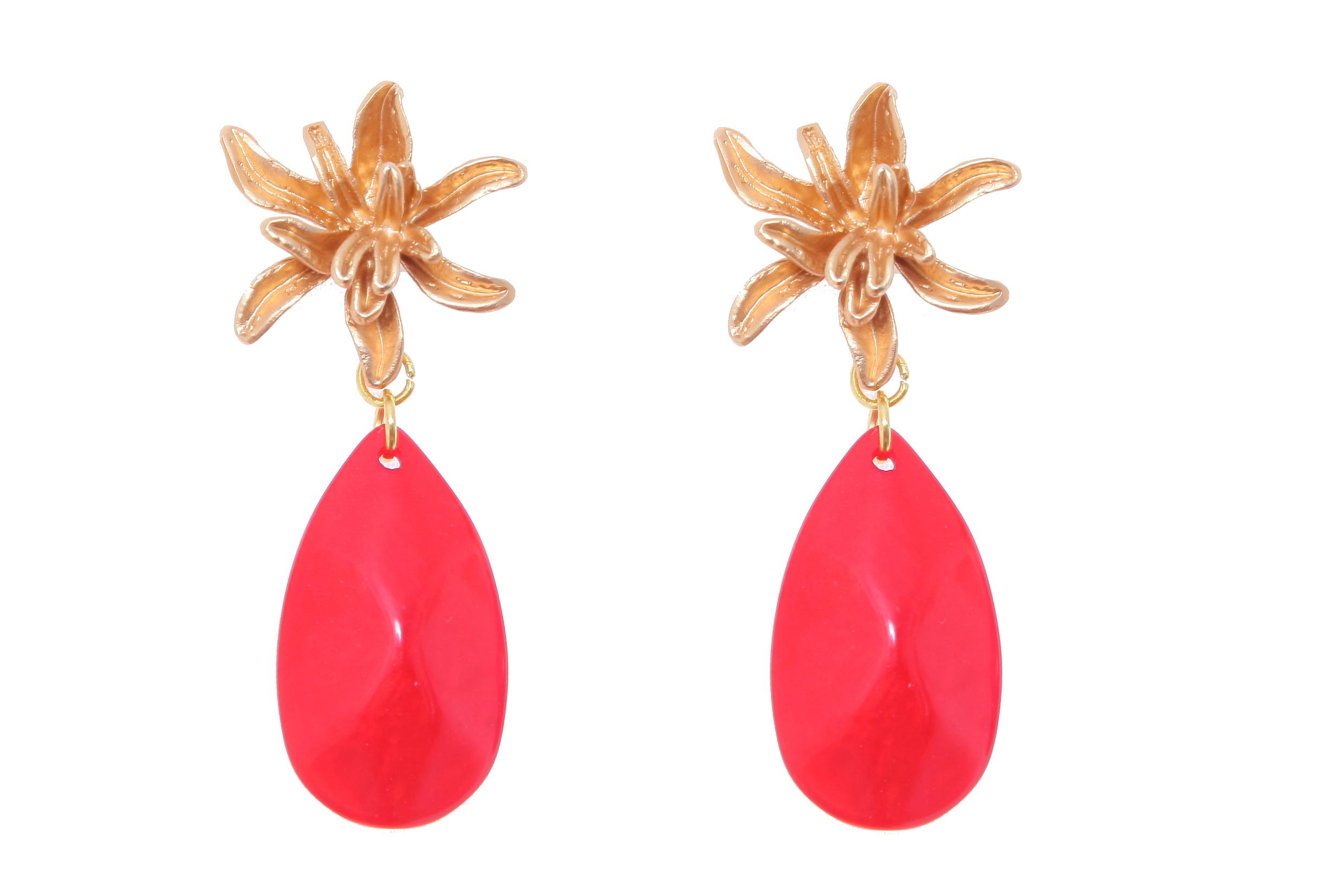 Pendiente de flamenca de lágrima de piedra cristal color rojo con cabezal de flor