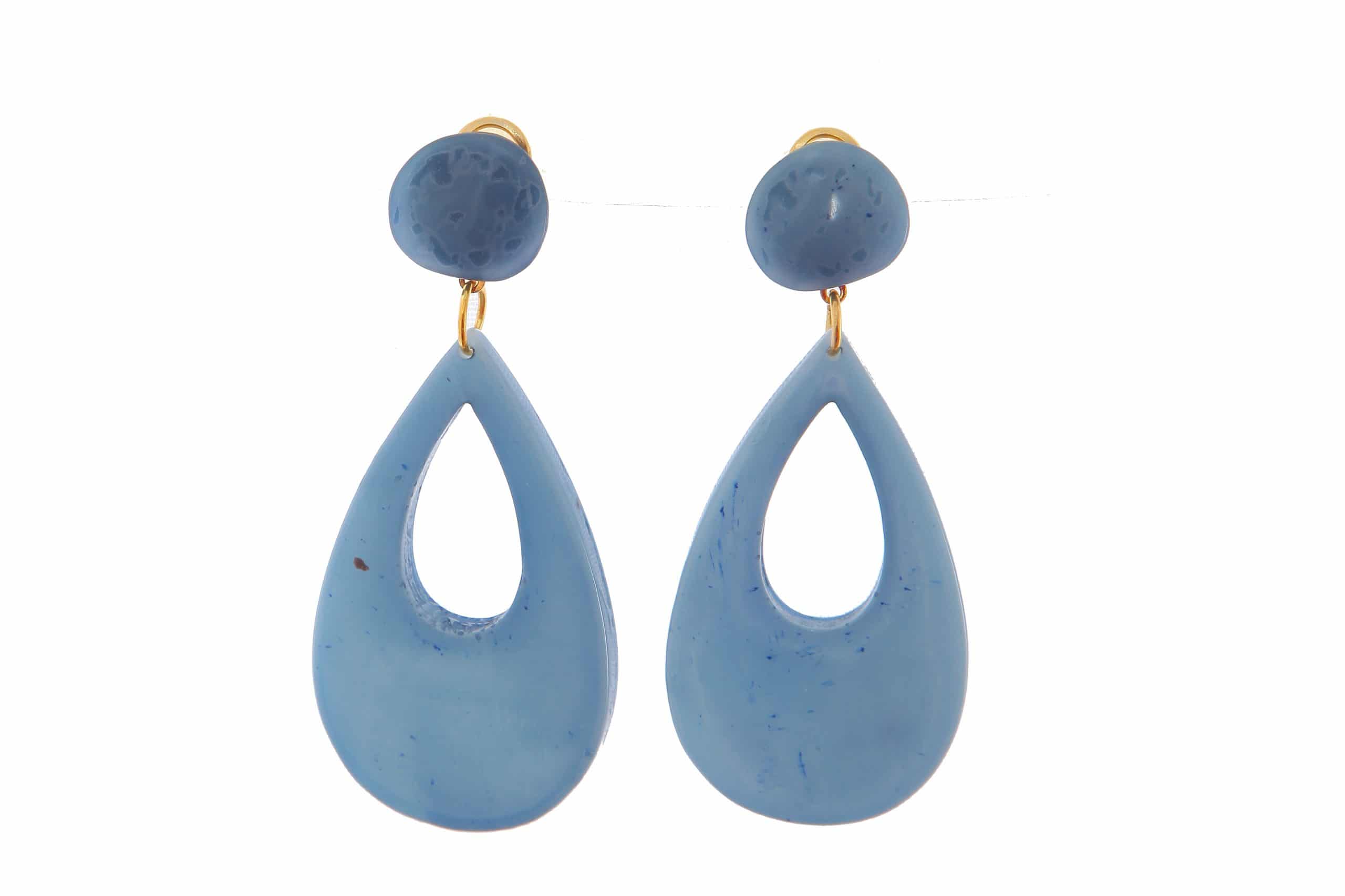 Pendiente de flamenca de resina cristal de color Azul Ducado. Cierre omega. Medida 30x55mm (sin cabezal). Fabricado artesanalmente en la provincia de Sevilla.