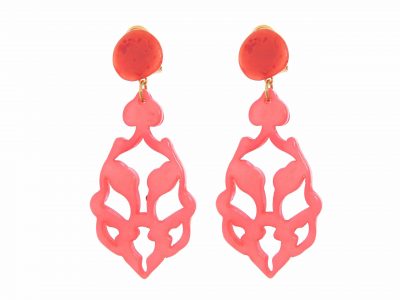 Pendiente de flamenca de resina cristal de color Coral. Cierre omega. Medida 30x60mm (sin cabezal). Fabricado artesanalmente en la provincia de Sevilla.