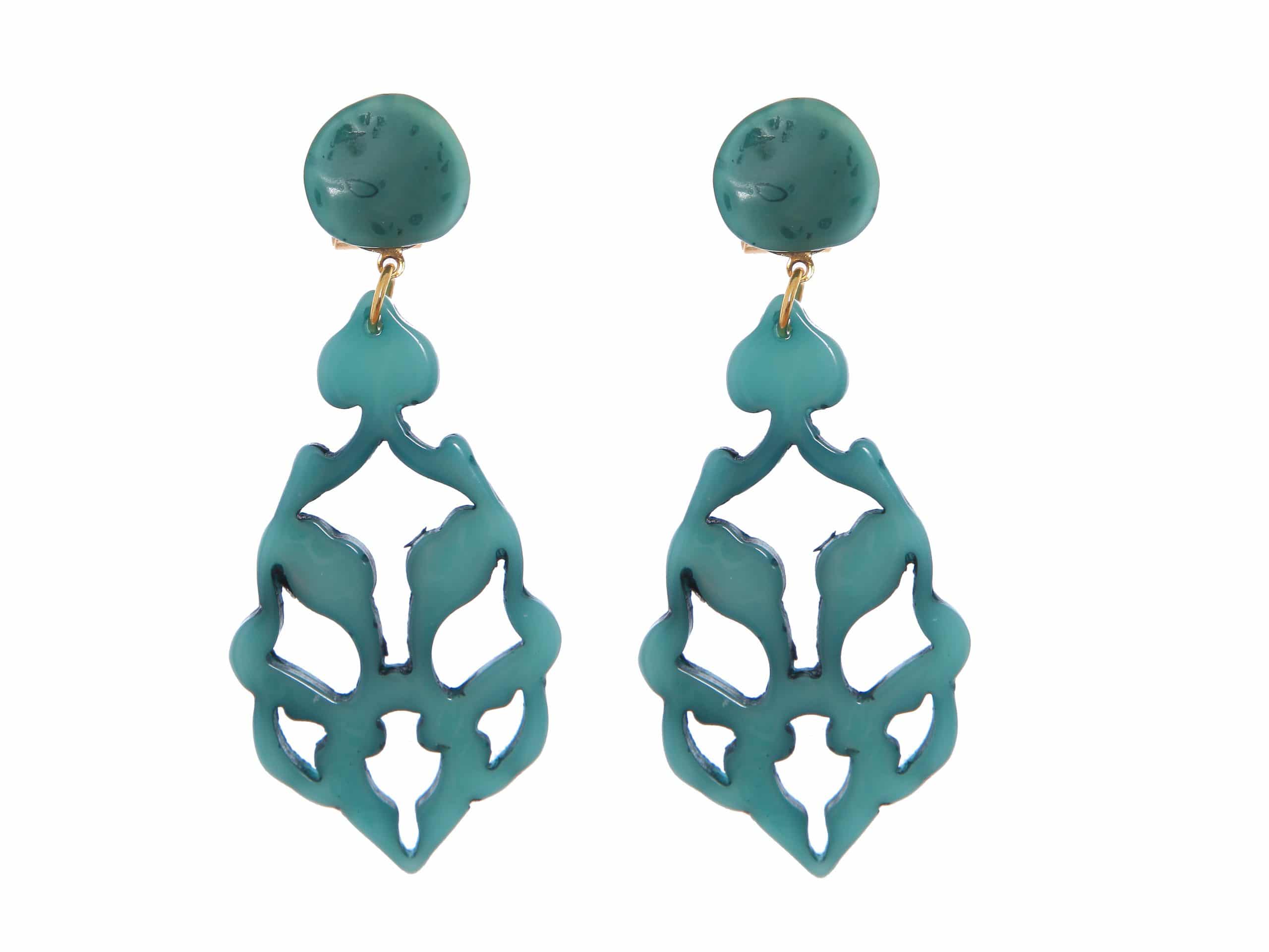 Pendiente de flamenca de resina cristal de color Verde Agua. Cierre omega. Medida 30x60mm (sin cabezal). Fabricado artesanalmente en la provincia de Sevilla.