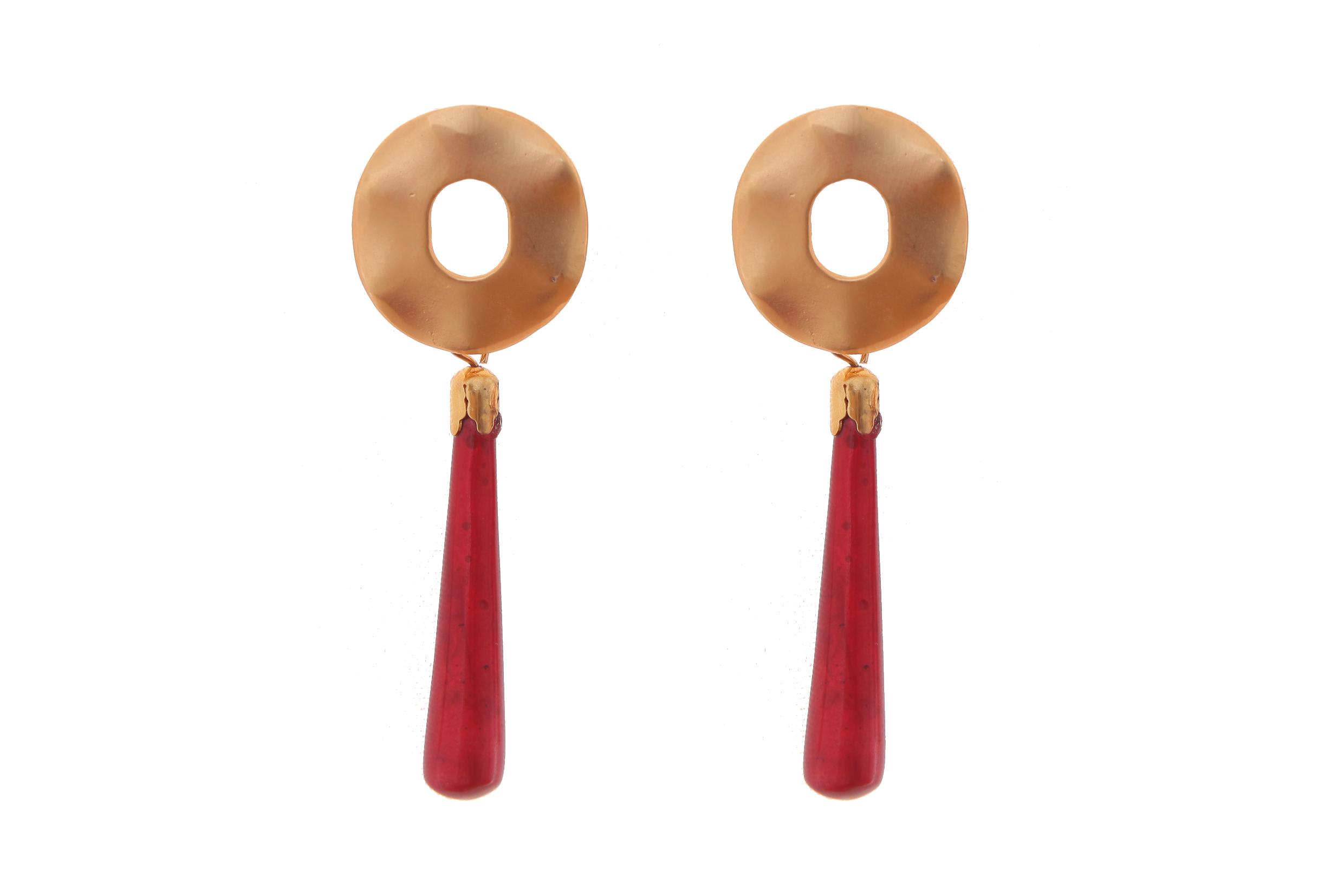 Pendiente de flamenca de lágrima pequeña de piedra cristal color burdeos cabezal círculo metal. Cierre de tornillo. Medidas 25x70mm (con cabezal). Fabricado artesanalmente en la provincia de Sevilla.