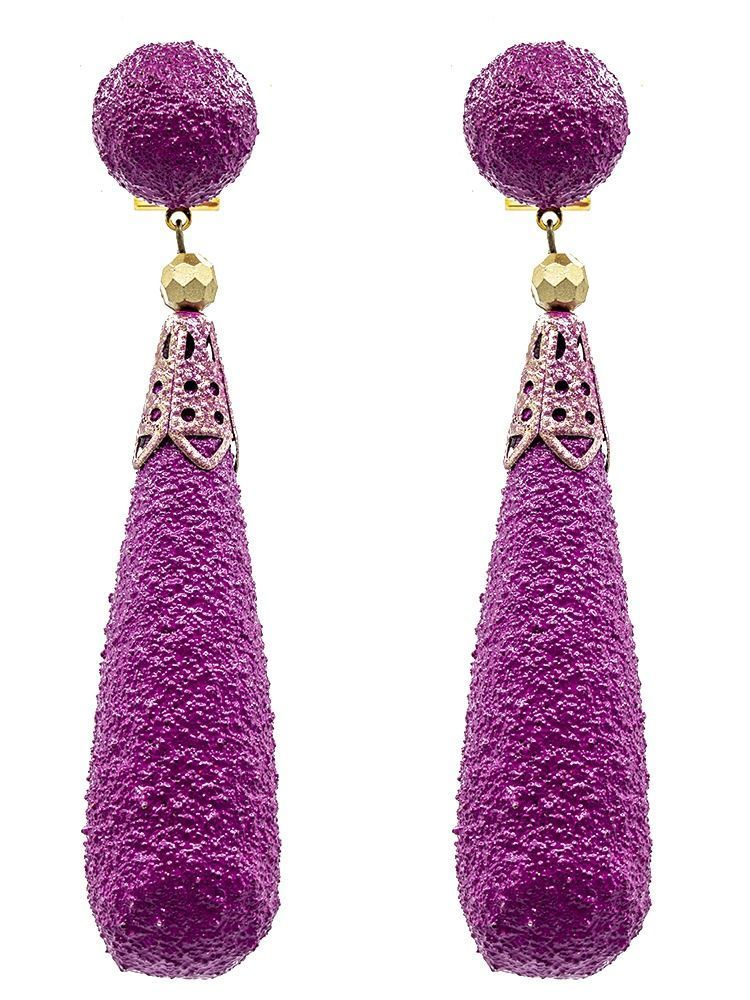 Pendiente de flamenca de nácar en color cardenal medio en forma de lágrima, con fornitura metálica, cierre omega, y con medidas: 20 x 70 mm (sin cabezal). Fabricado artesanalmente en Sevilla.