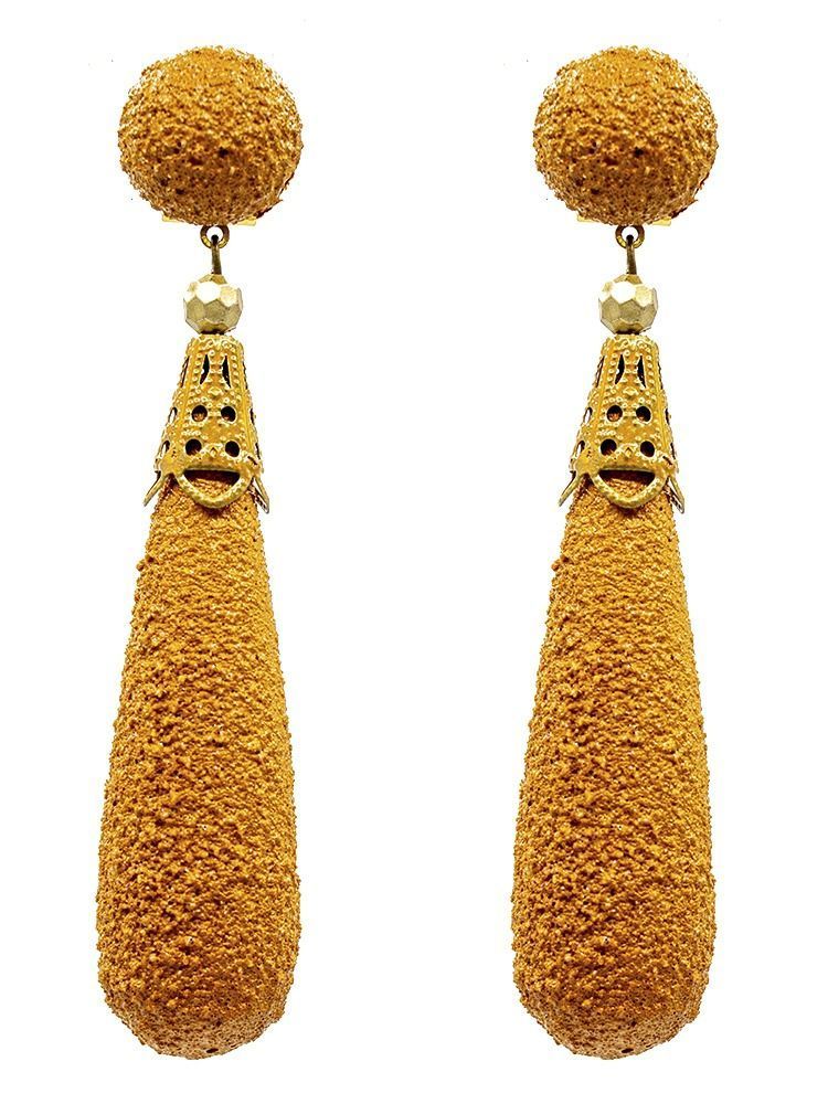 Pendiente de flamenca de nácar en color ocre en forma de lágrima, con fornitura metálica, cierre omega, y con medidas: 20 x 70 mm (sin cabezal). Fabricado artesanalmente en Sevilla.