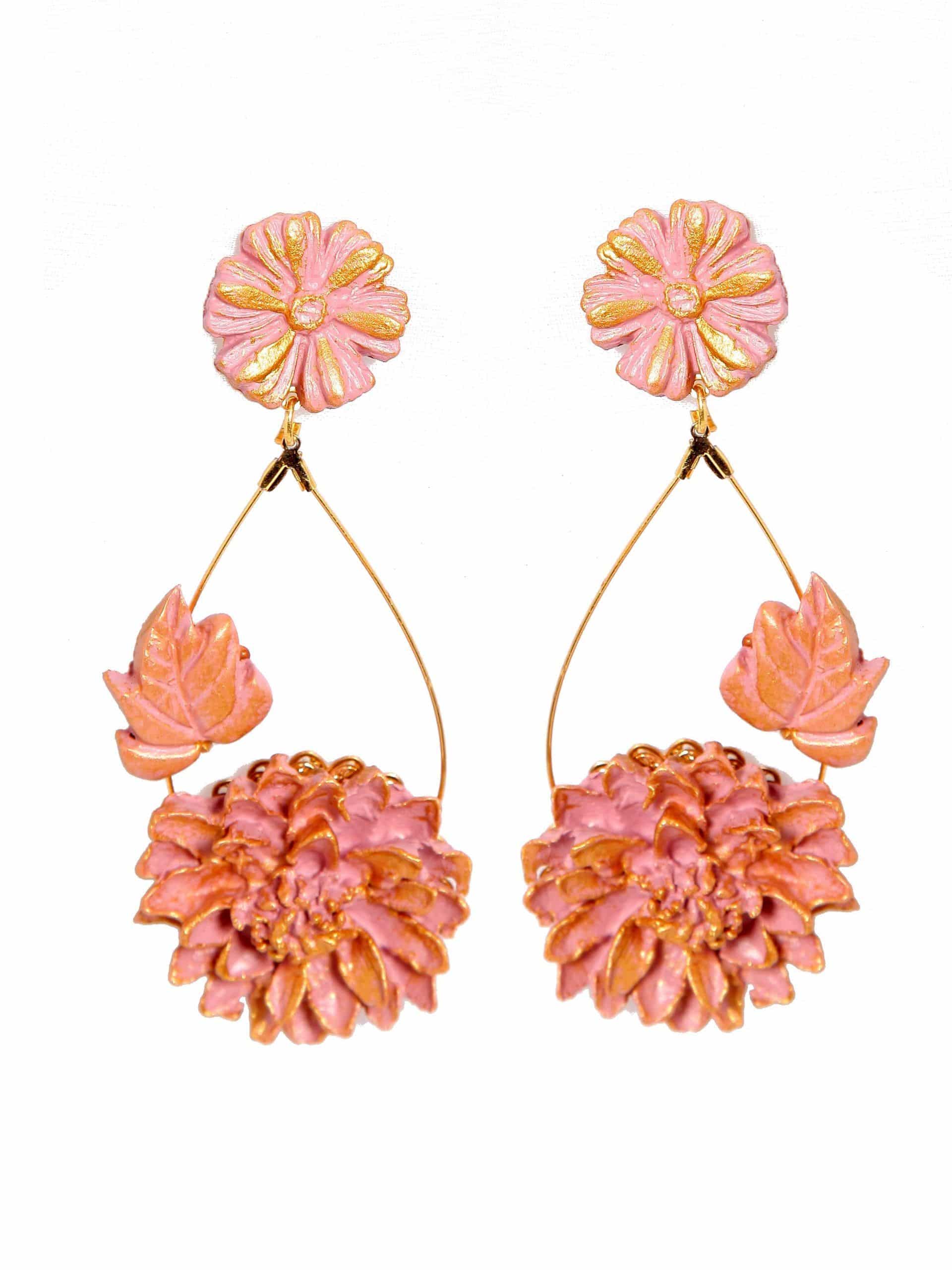 Pendiente de flamenca de porcelana, color malva pastel con reflejos dorados, con forma de lágrima, fornitura metálica, cierre omega y con medidas: 46 x 75 mm. Las flores están elaboradas delicadamente a mano con porcelana fría. Fabricado artesanalmente en Sevilla.