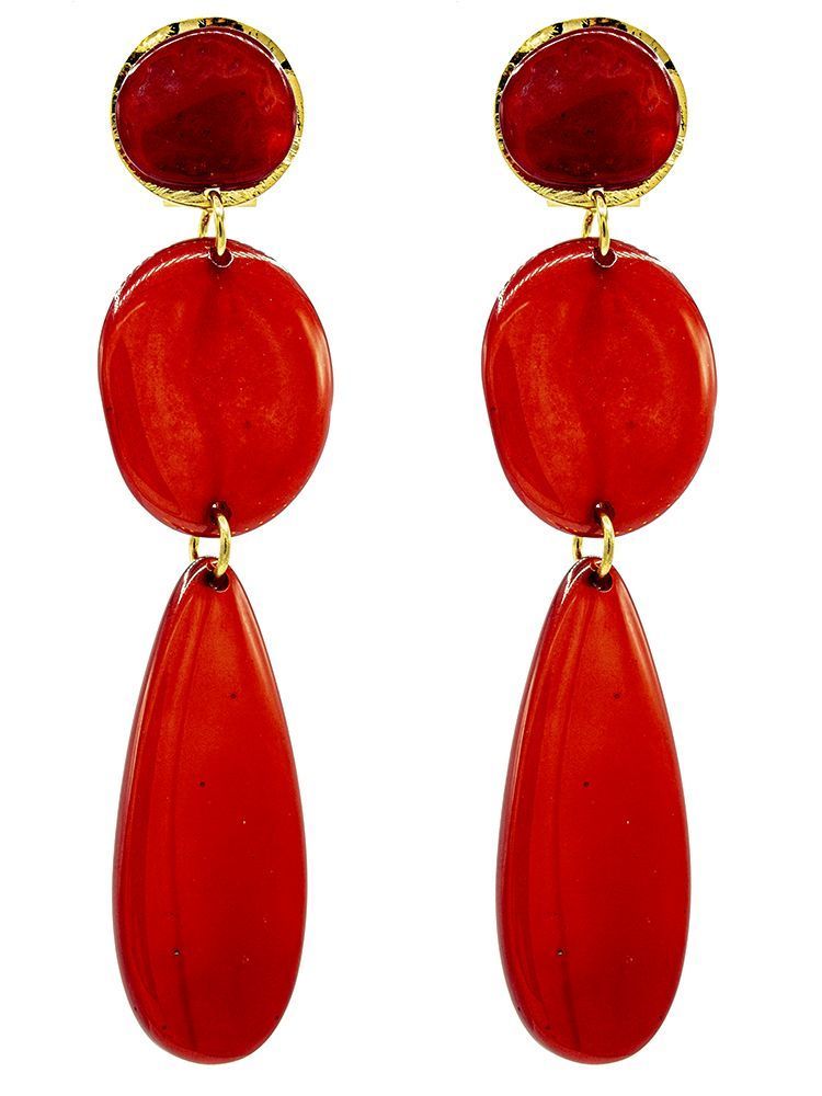 Pendiente de flamenca de resina cristal, en color rojo, con forma de lágrima, fornitura metálica, cierre omega y con medidas sin cabezal de: 25 x 75 mm. Fabricado artesanalmente en Sevilla.