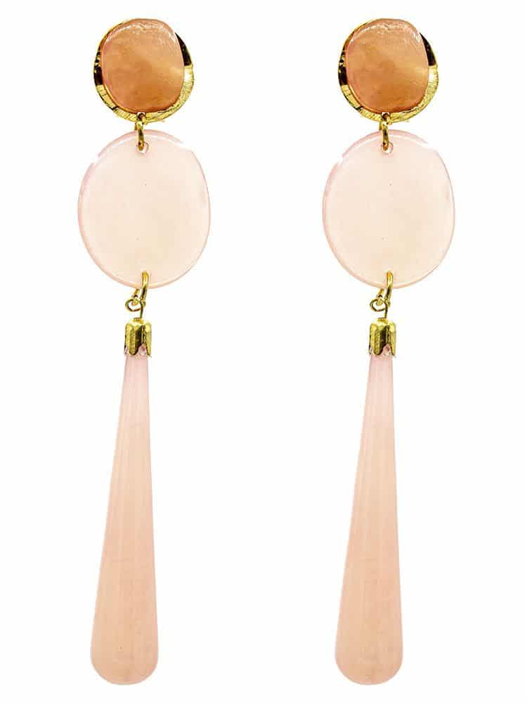 Pendiente de flamenca de resina cristal, en color rosa palo, con forma de lágrima, fornitura metálica, cierre omega y con medidas sin cabezal de: 25 x 95 mm. Fabricado artesanalmente en Sevilla.