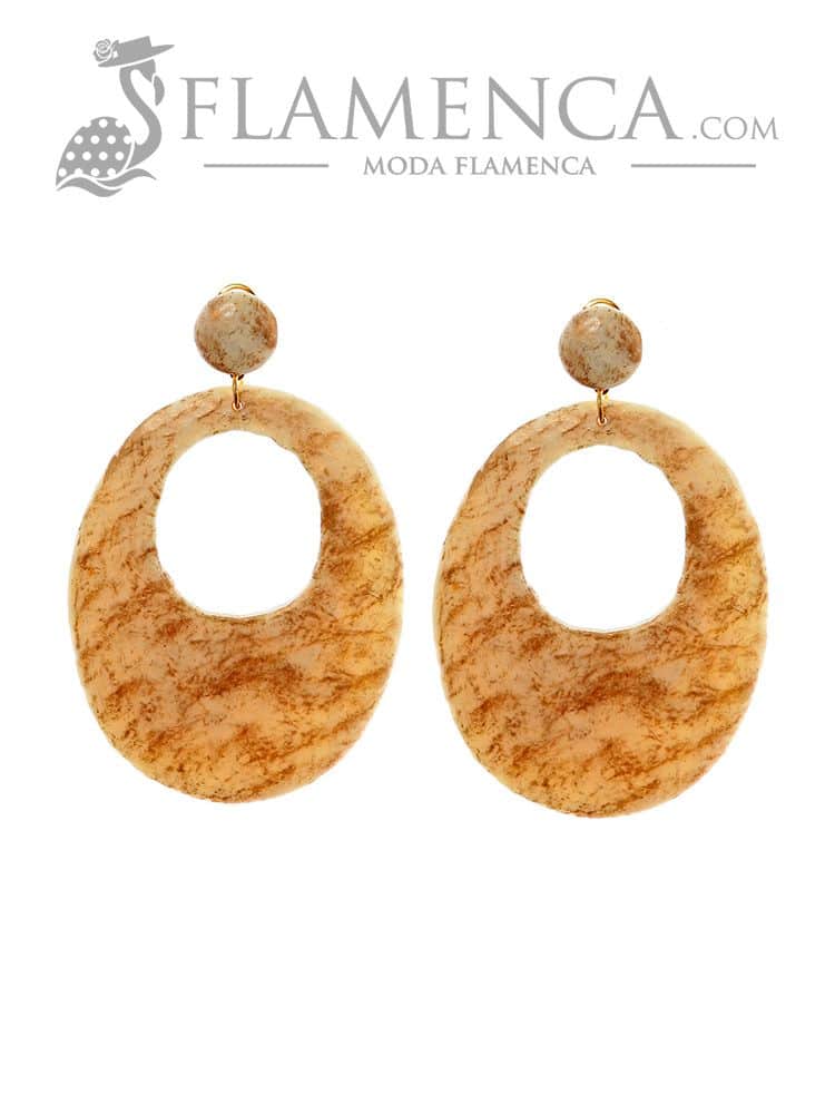 Pendiente de flamenca de resina en color marfil con reflejos en oro, en forma de aro, fornitura metálica, cierre omega, y con medidas: 64 x 83 mm (sin cabezal). Fabricado artesanalmente en Sevilla.