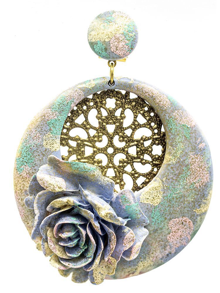 Pendiente de flamenca de resina, en tonos pastel, en forma de aro, estilo floral, cierre omega y una medida de 65 x 65 mm. Fabricado artesanalmente en Sevilla.