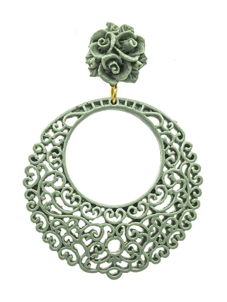 Pendiente de flamenca de resina, en color verde caki, con forma de aro, de filigrana, cierre omega y una medida de 55 x 55 mm, tamaño mediano. Fabricado artesanalmente en Sevilla.